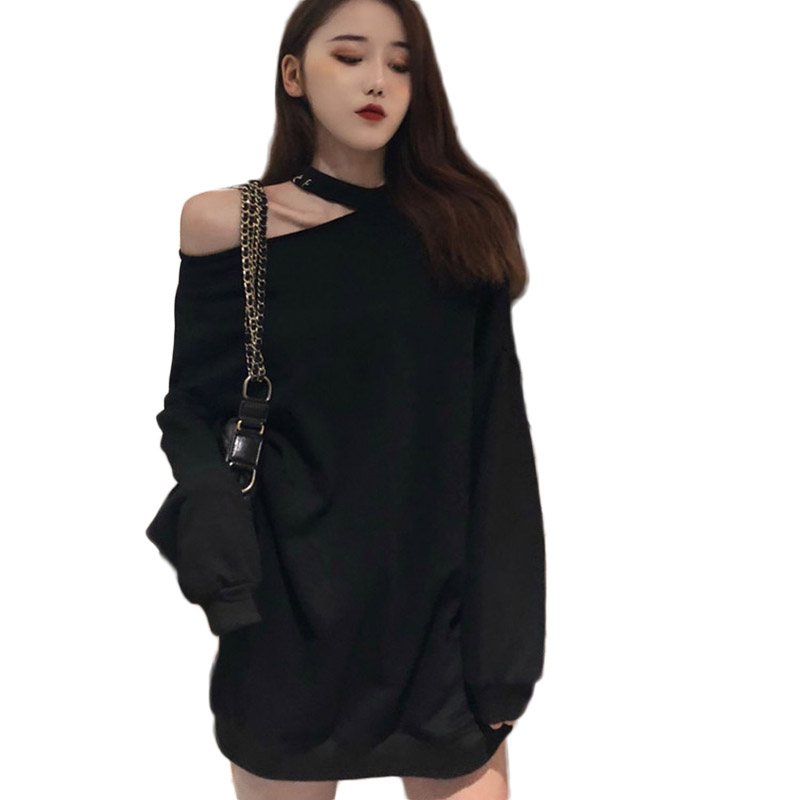 chic早秋上衣慵懶中長款純色衛衣女秋2018新款高領加絨露肩掛脖女