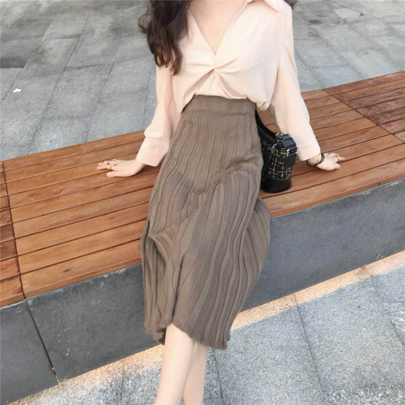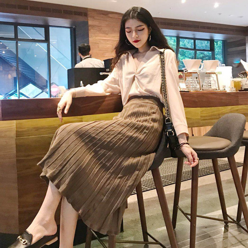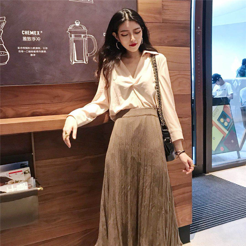/ 時尚套裝女秋季新款設計感V領長袖襯衫上衣+高腰針織百褶半身裙子