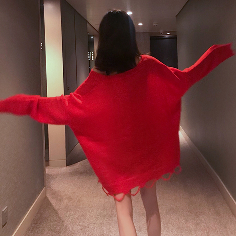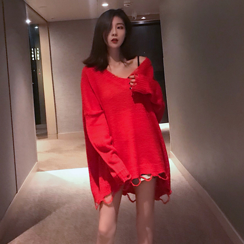 秋裝針織上衣女2018新款慵懶毛衣復古寬松時尚破洞V領長袖打底衫