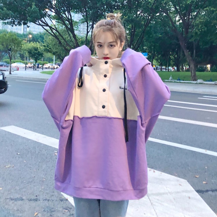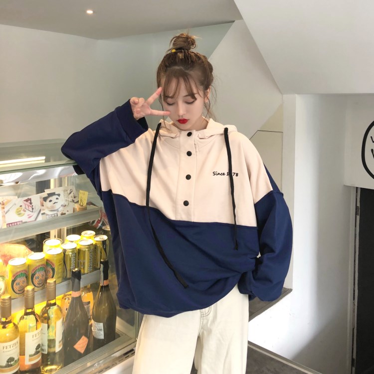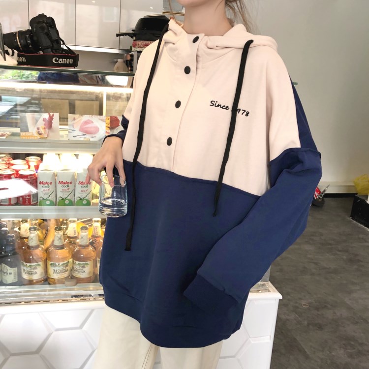 / 秋冬女裝韓版中長款學院風寬松拼接撞色連帽套頭超火衛衣上衣外套