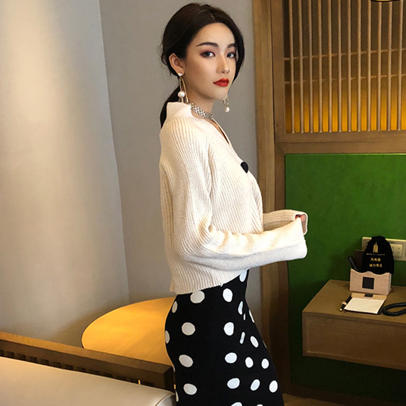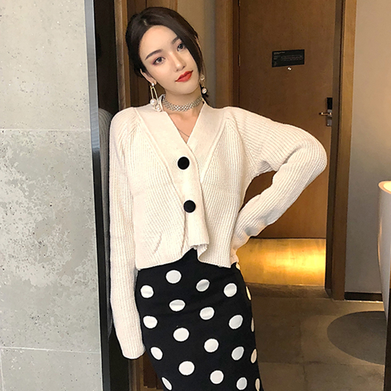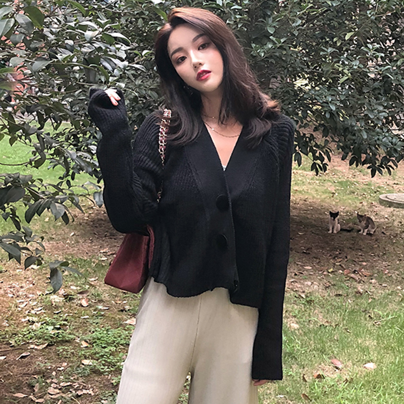 / 慵懶風V領長袖針織開衫女秋冬裝新款寬松短外套學生時尚黑色上衣