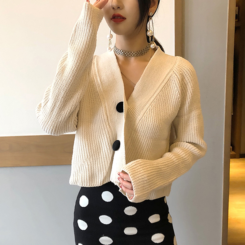 慵懶風V領長袖針織開衫女秋冬裝新款寬松短外套學生時尚黑色上衣