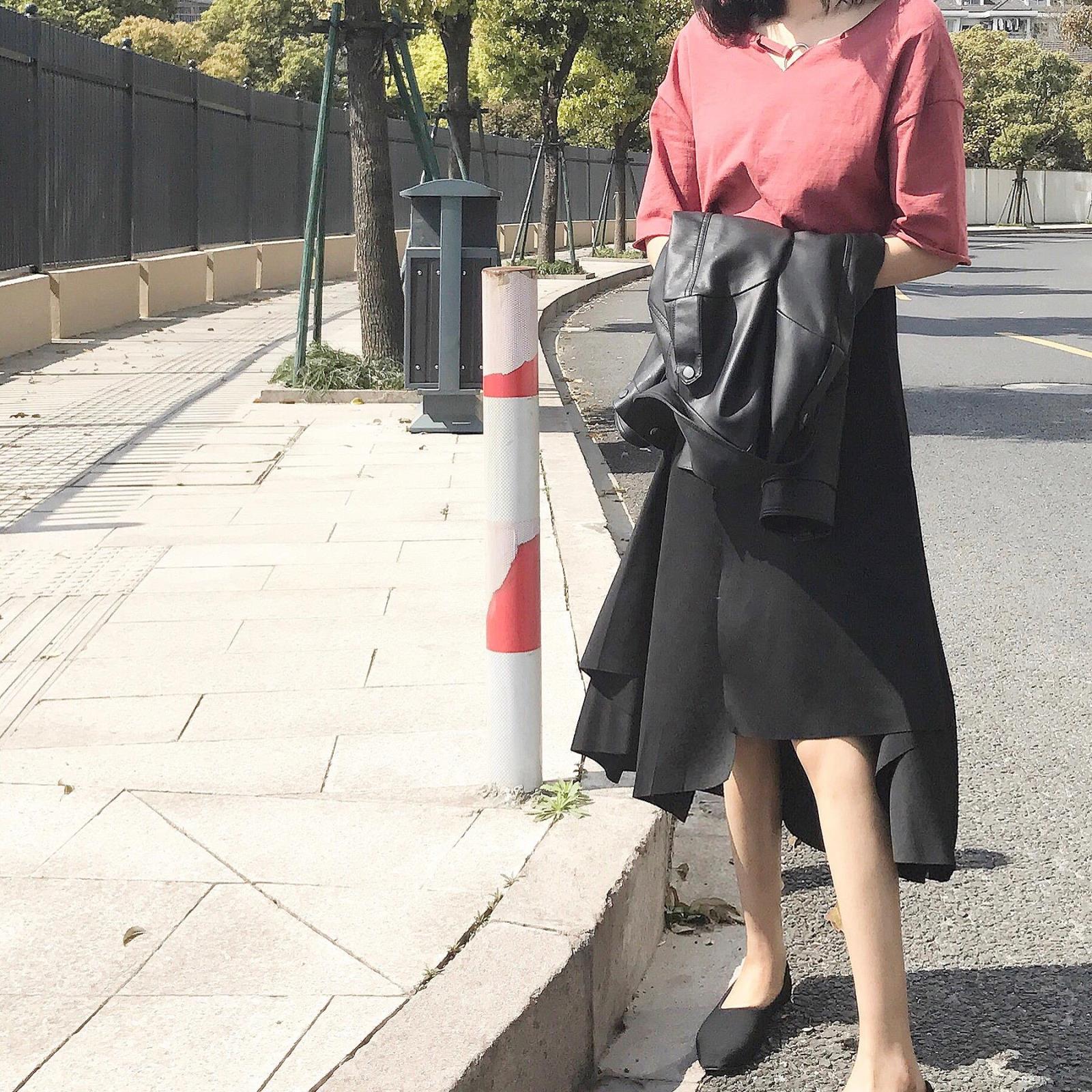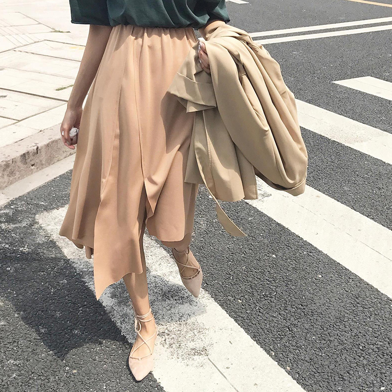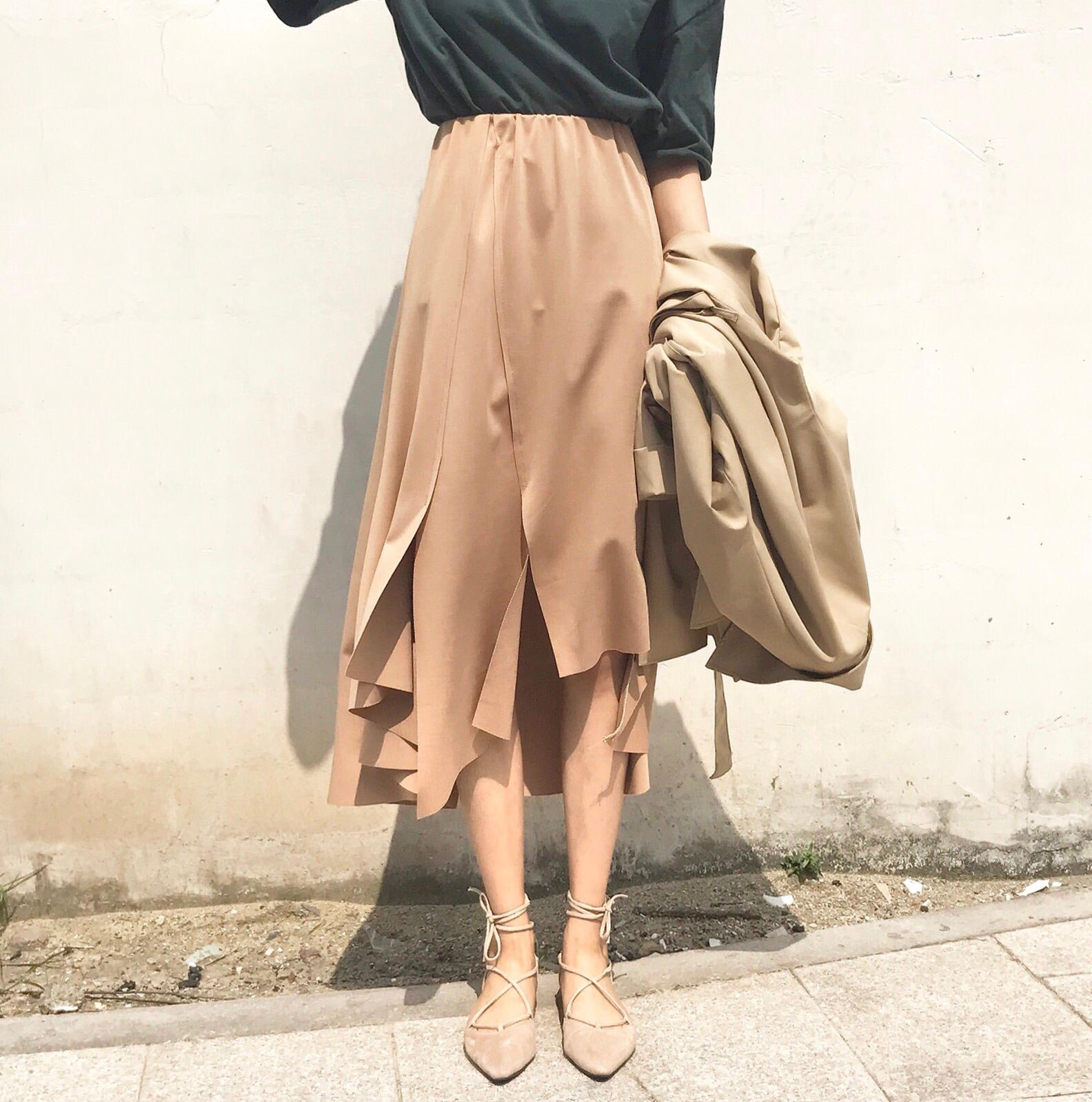 復古韓國chic風高腰顯瘦純色不規則半身裙女春秋氣質中長裙