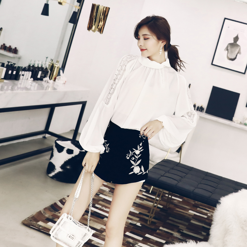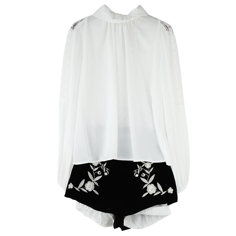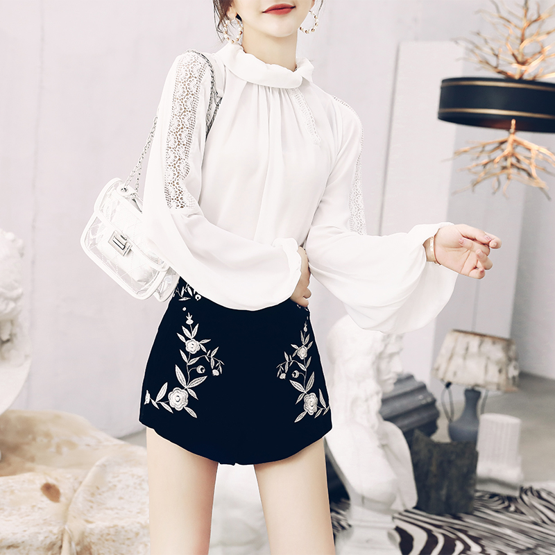 復古名媛繡花套裝女夏秋季2018新款高腰短褲長袖襯衣時尚兩件套潮