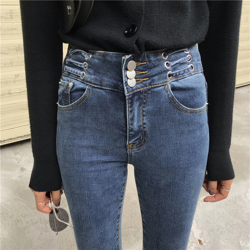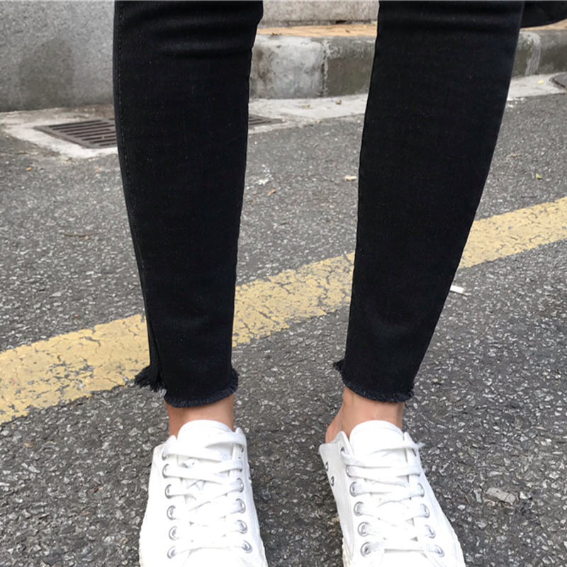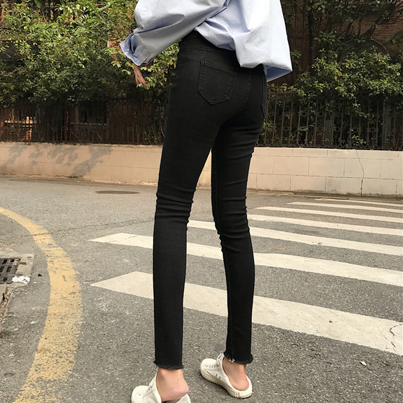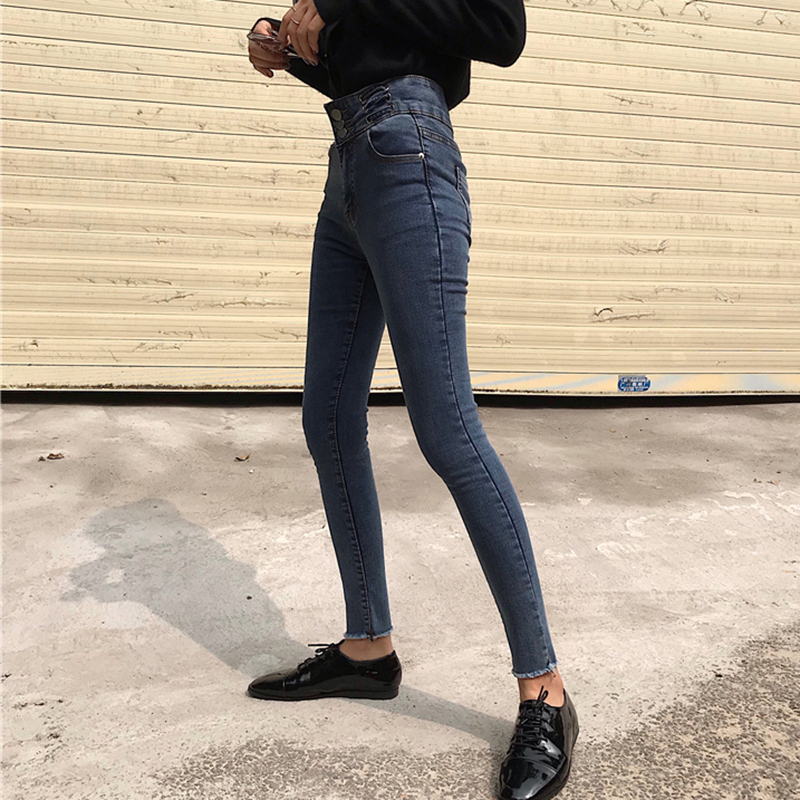 高腰加絨黑色緊身牛仔褲女秋冬裝新款復古風學生休閑九分鉛筆褲子