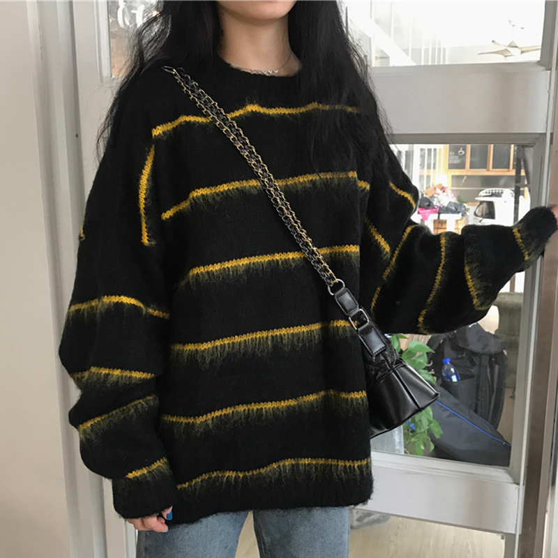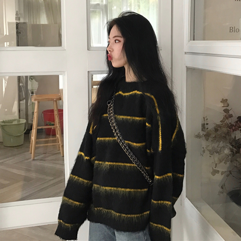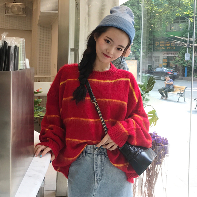 / 慵懶風套頭毛衣秋裝女新款寬松毛邊條紋長袖外套港味復古時尚上衣