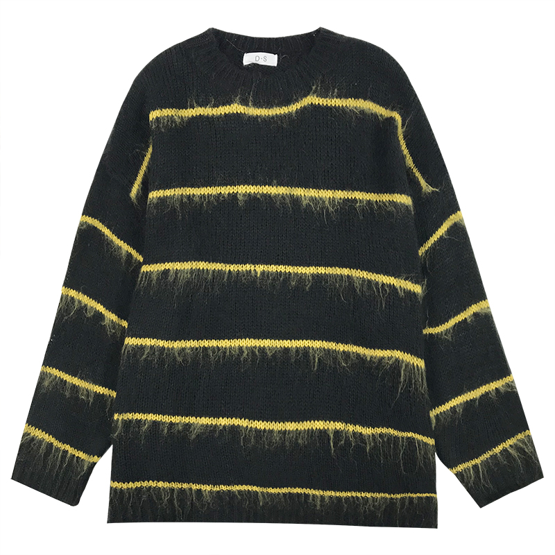 慵懶風套頭毛衣秋裝女新款寬松毛邊條紋長袖外套港味復古時尚上衣