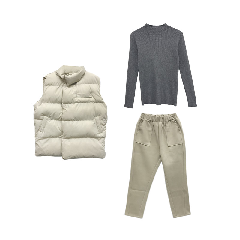 一字肩兩穿針織衫打底上衣+無袖加厚面包棉服馬甲+針織哈倫褲套裝