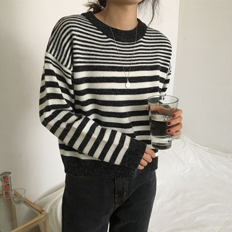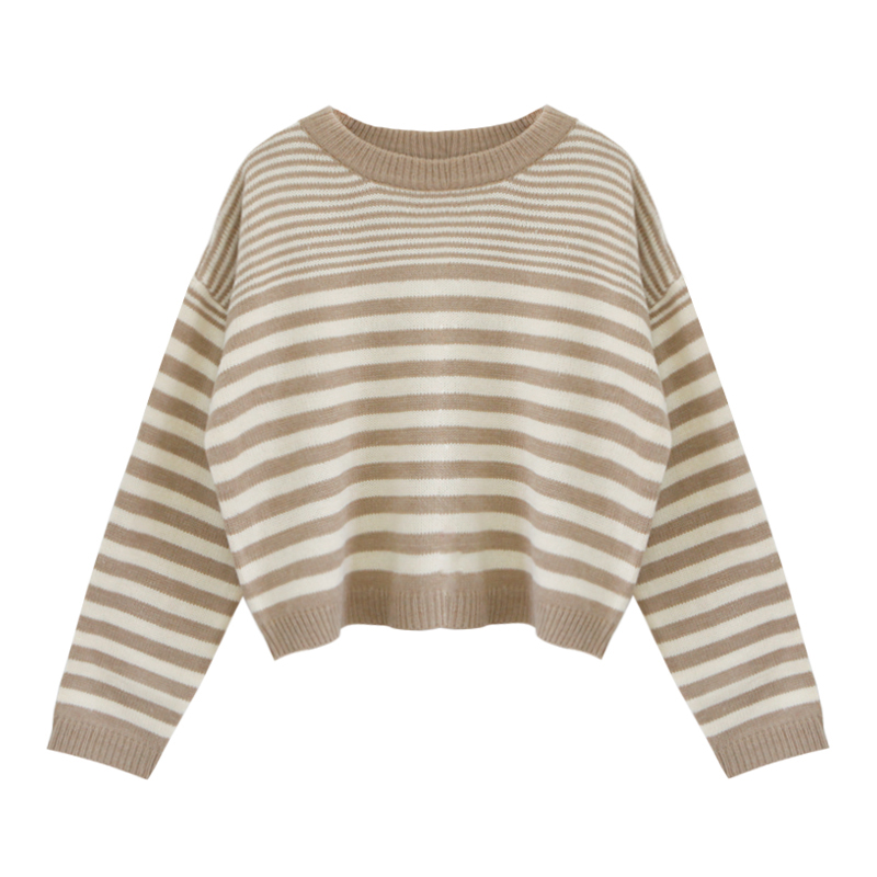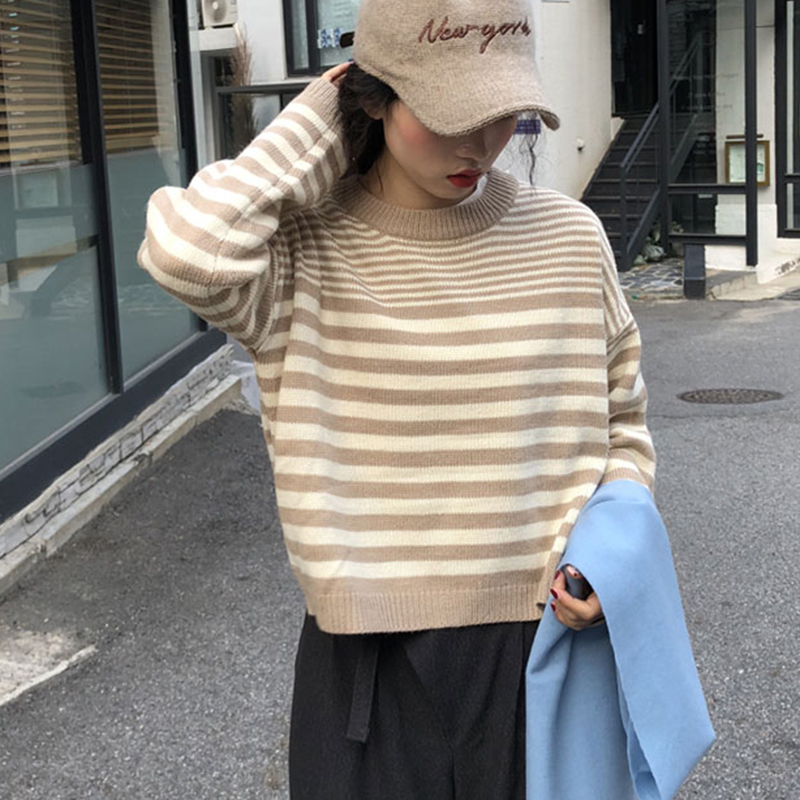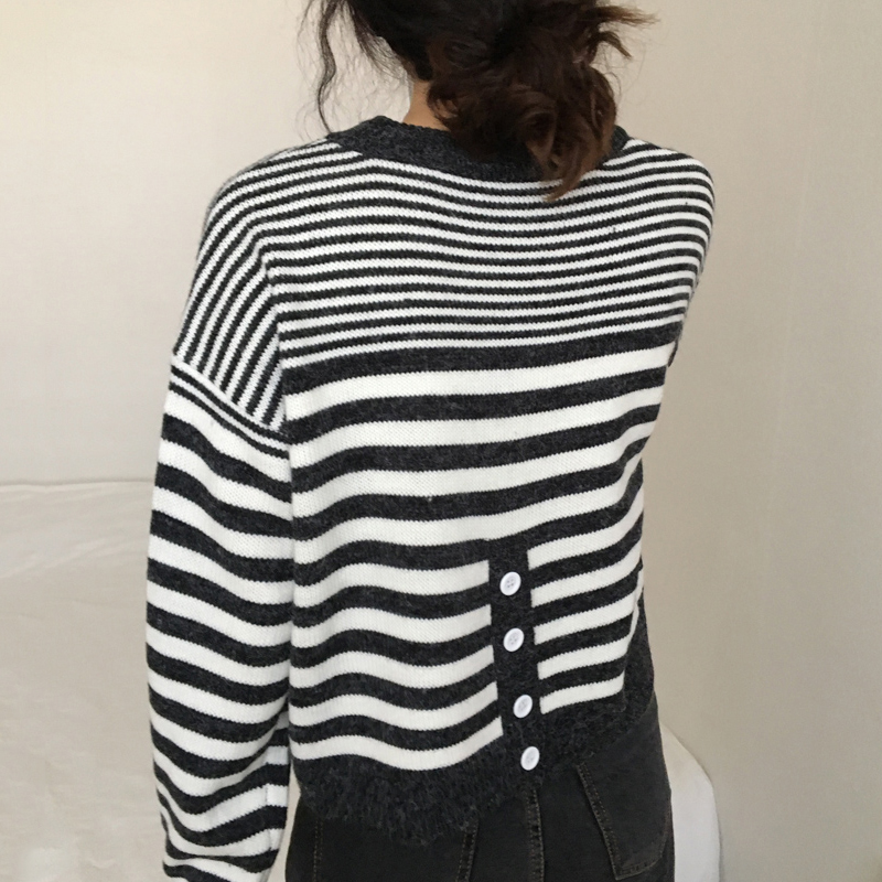 短款條紋長袖針織衫女秋冬裝2018新款韓版寬松后背紐扣毛衣外套潮