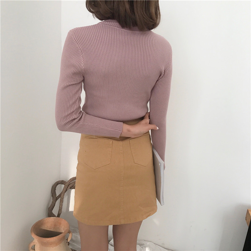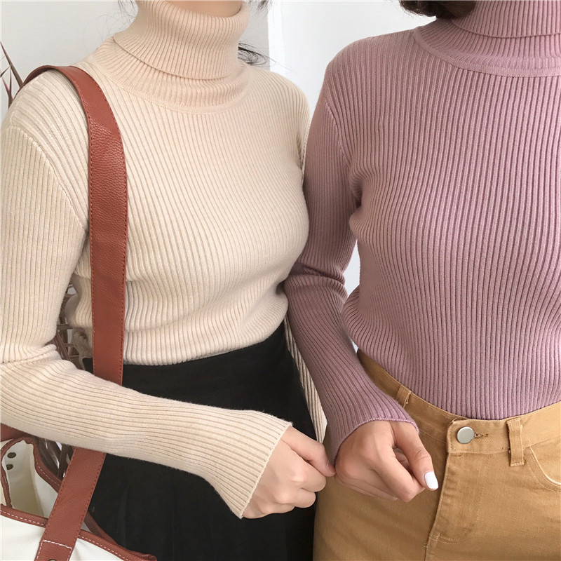 秋裝女2018新款純色高領長袖針織打底衫上衣修身顯瘦套頭薄款毛衣