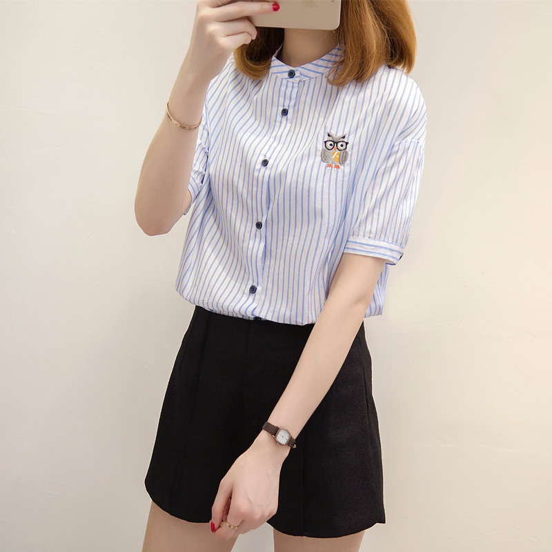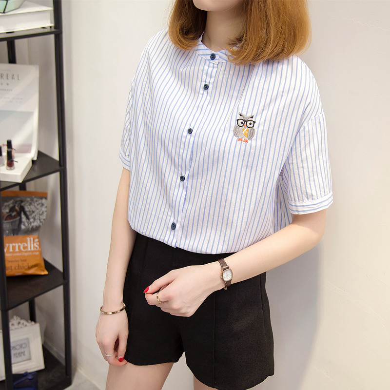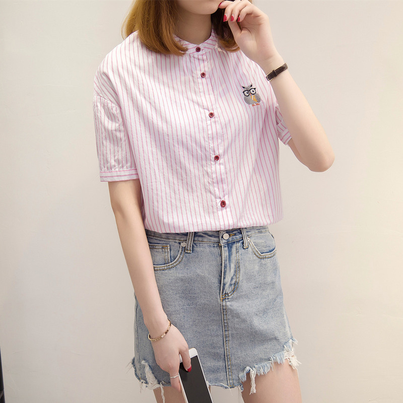 條紋襯衫女長袖小清新上衣女夏寬松半袖韓版bf風襯衣女百搭學生