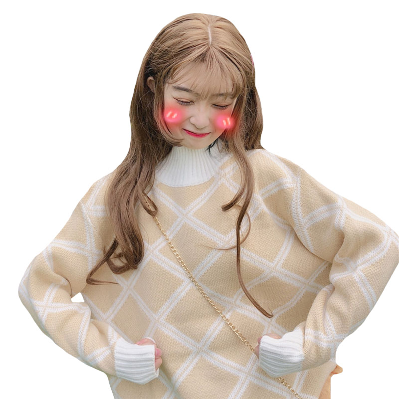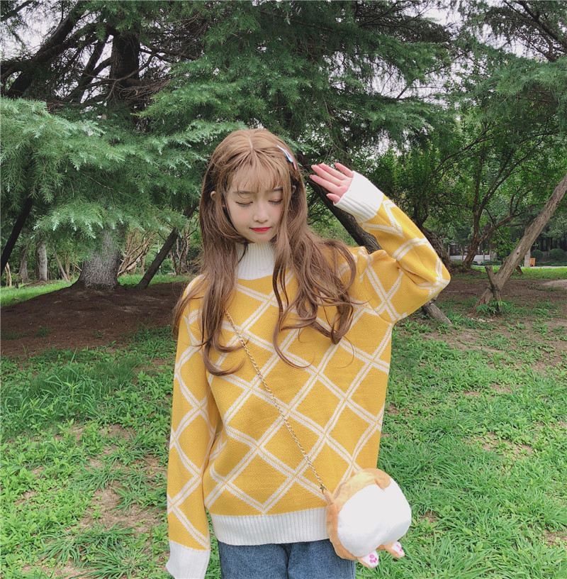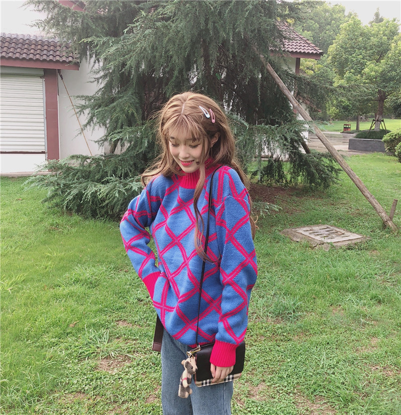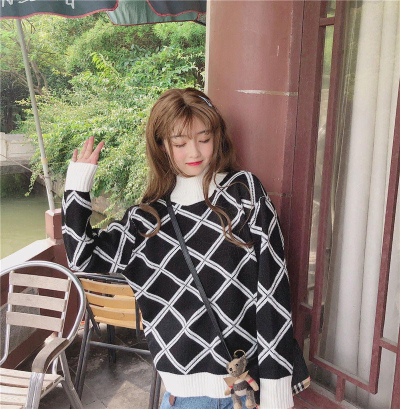 秋裝女裝韓版學院風BF風寬松高領菱格網紅套頭針織衫毛衣上衣外套