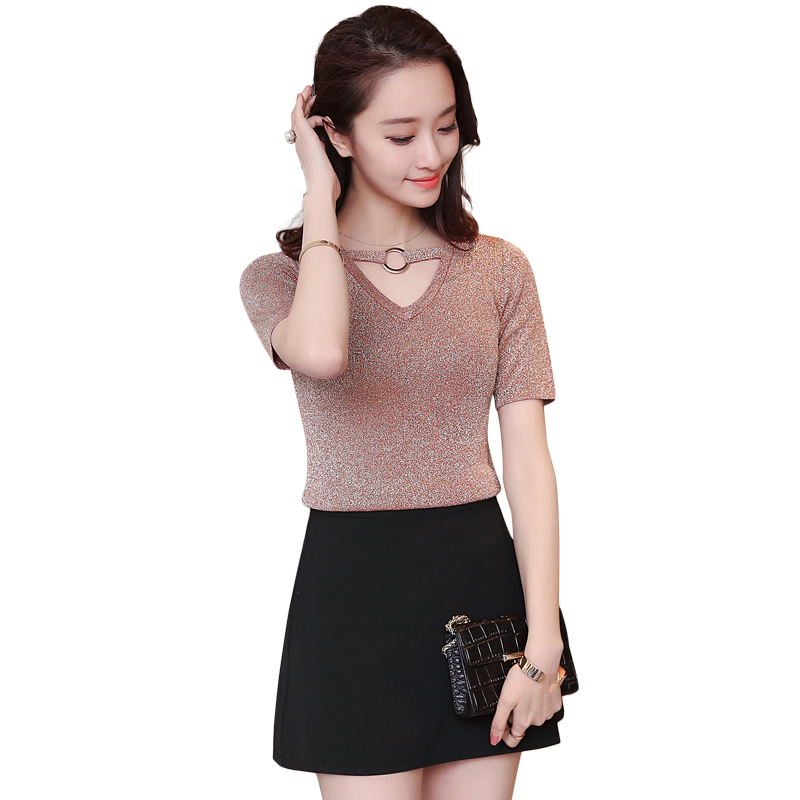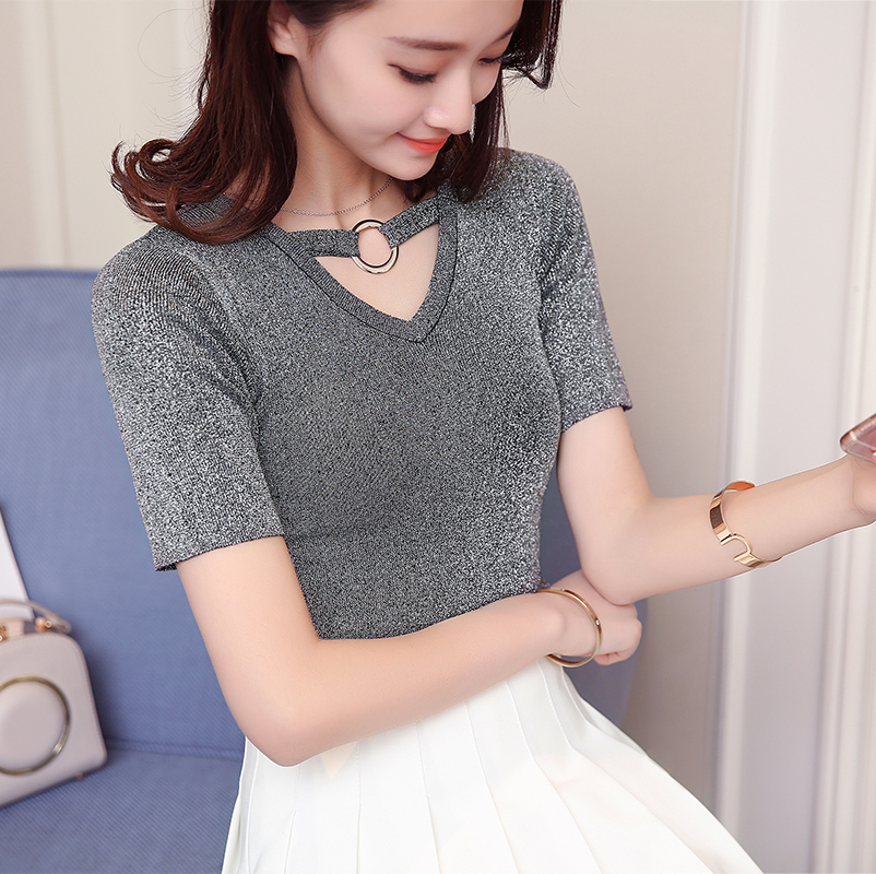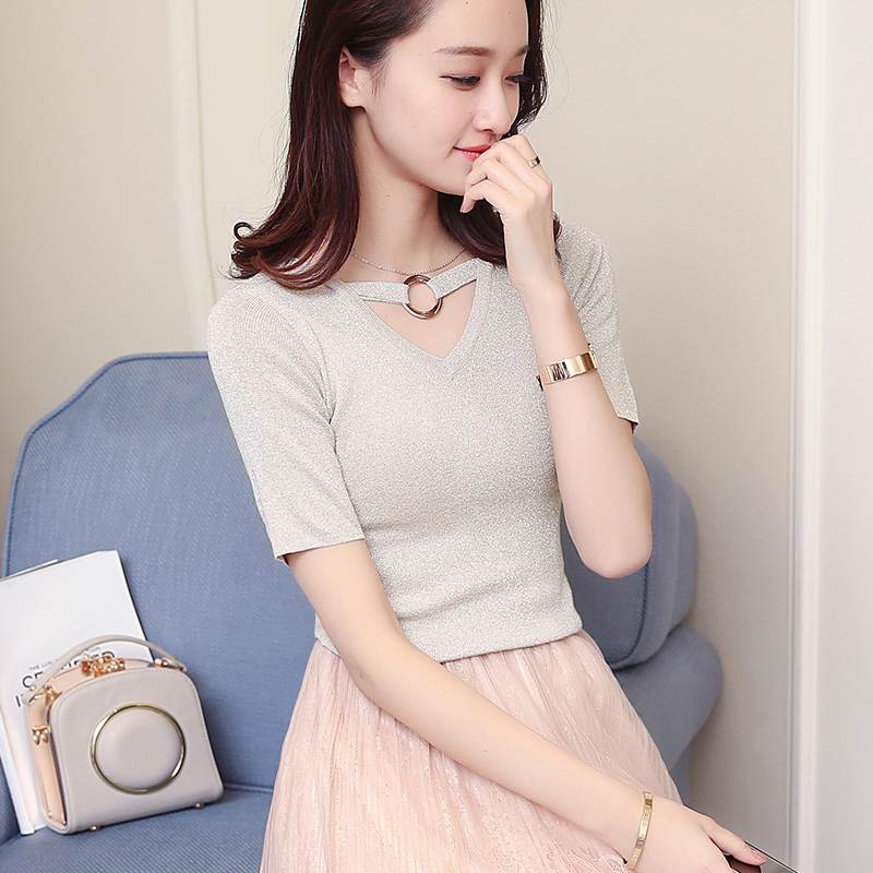 / 亮絲金線針織衫女短袖t恤打底衫潮新款韓版針織上衣女夏季薄