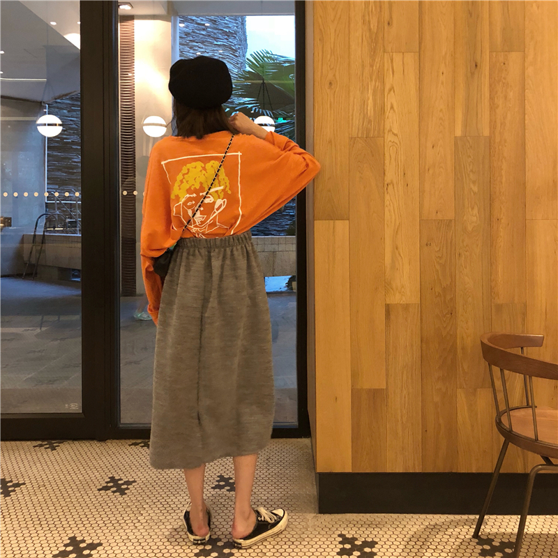 / 韓版時尚休閑套裝秋季女裝原宿風中長款長袖t恤+開叉半身裙兩件套