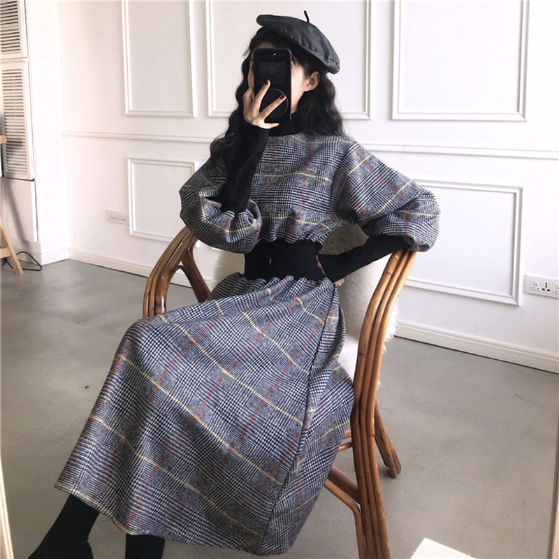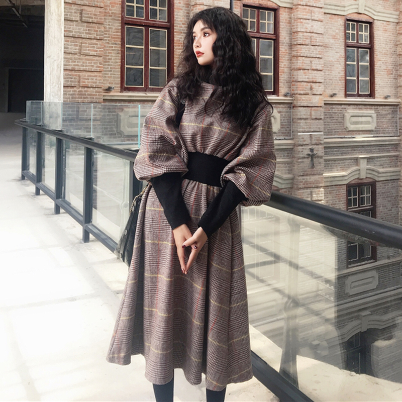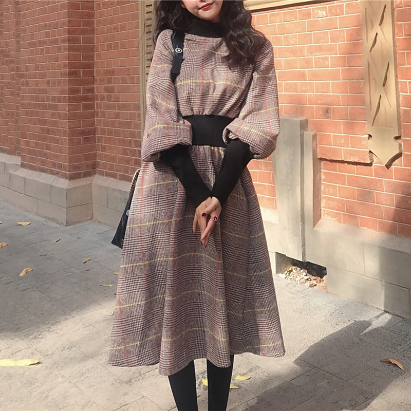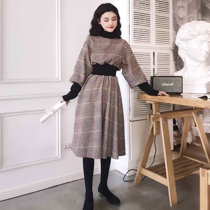 毛呢格子高領連衣裙女秋冬裝2018新款韓版寬松收腰泡泡袖A字裙子