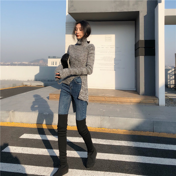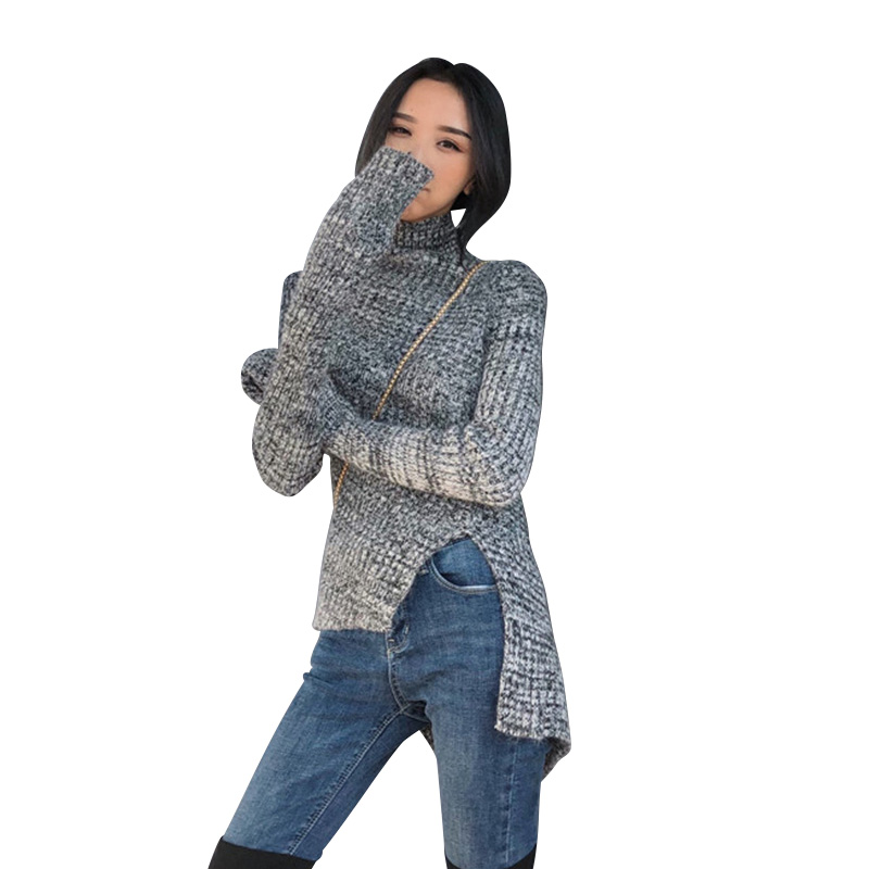 / 上衣女秋季新款韓版百搭高領修身顯瘦下擺開叉不規則毛衣針織衫潮