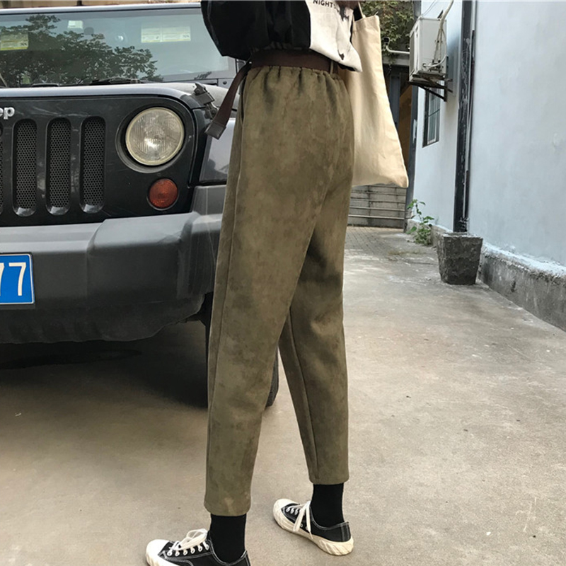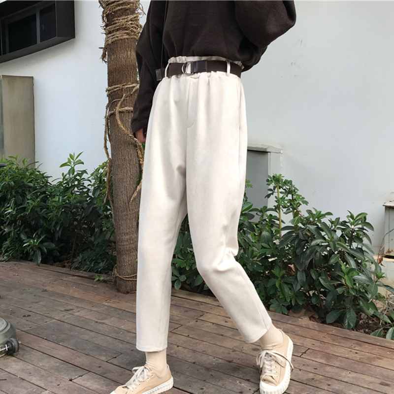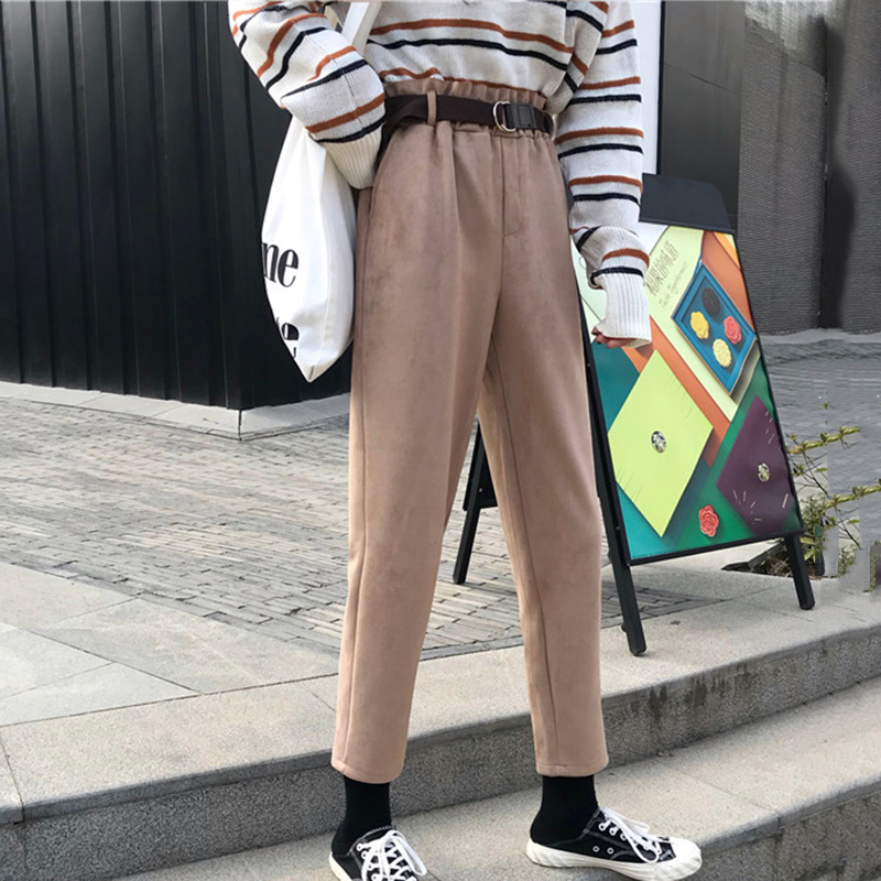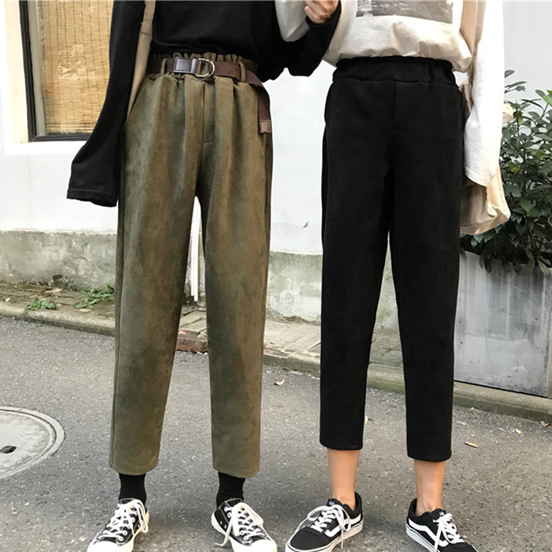 / 時尚絨面高腰顯瘦哈倫褲女秋裝新款韓版學生休閑褲黑色寬松九分褲