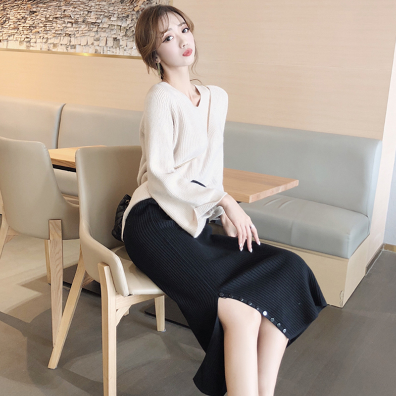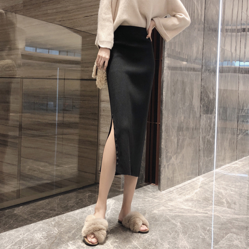 / 秋冬女裝2018新款學生復古風開叉黑色中長裙高腰顯瘦包臀半身裙子