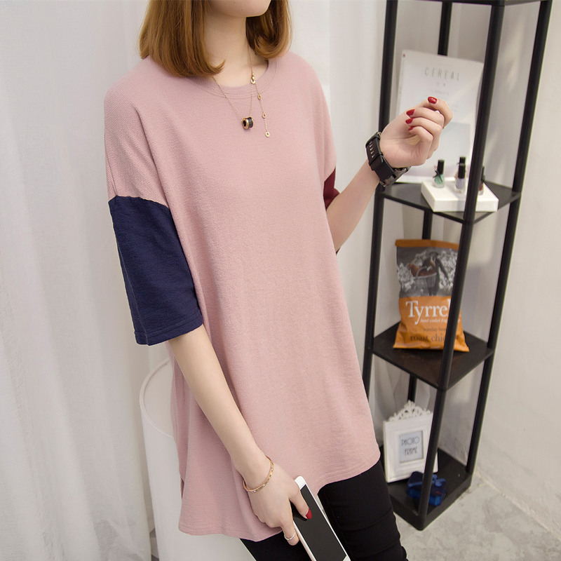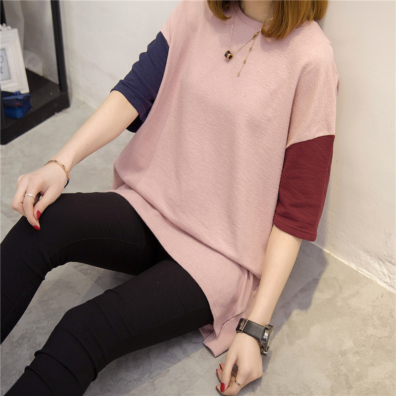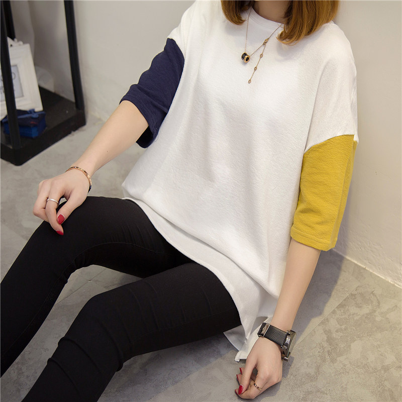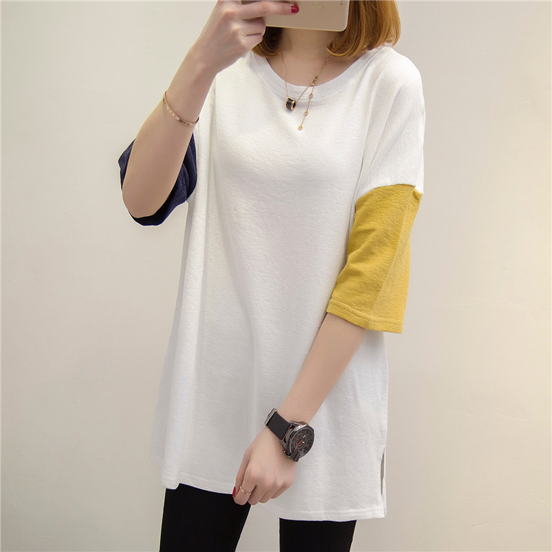 / 女裝夏裝新款潮中長款白色t恤女中長袖拼色圓領打底春季短袖
