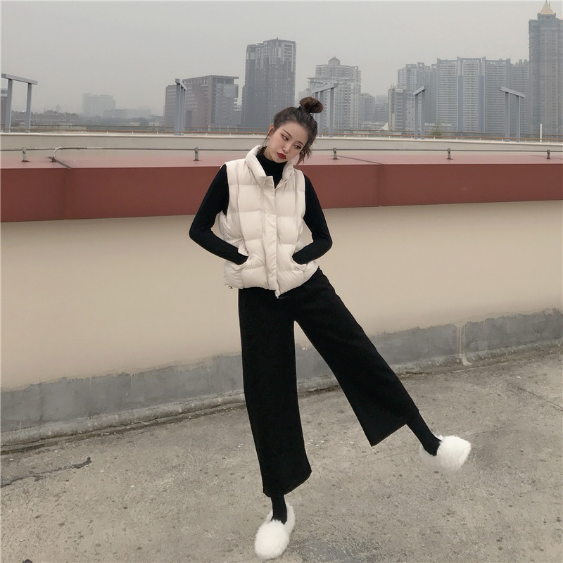 一字肩兩穿針織衫打底上衣+無袖加厚面包棉服馬甲+針織哈倫褲套裝