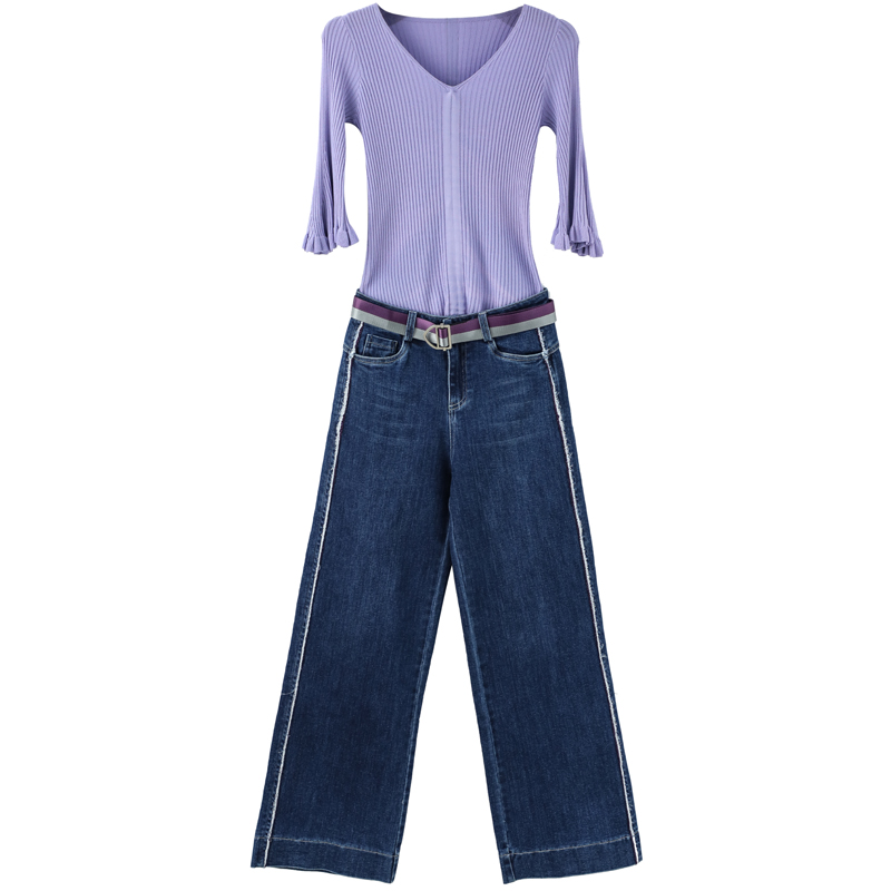 / 牛仔闊腿褲套裝女秋季韓版2018新款時髦女裝針織衫上衣休閑兩件套