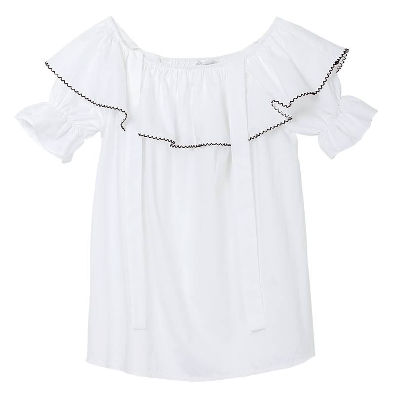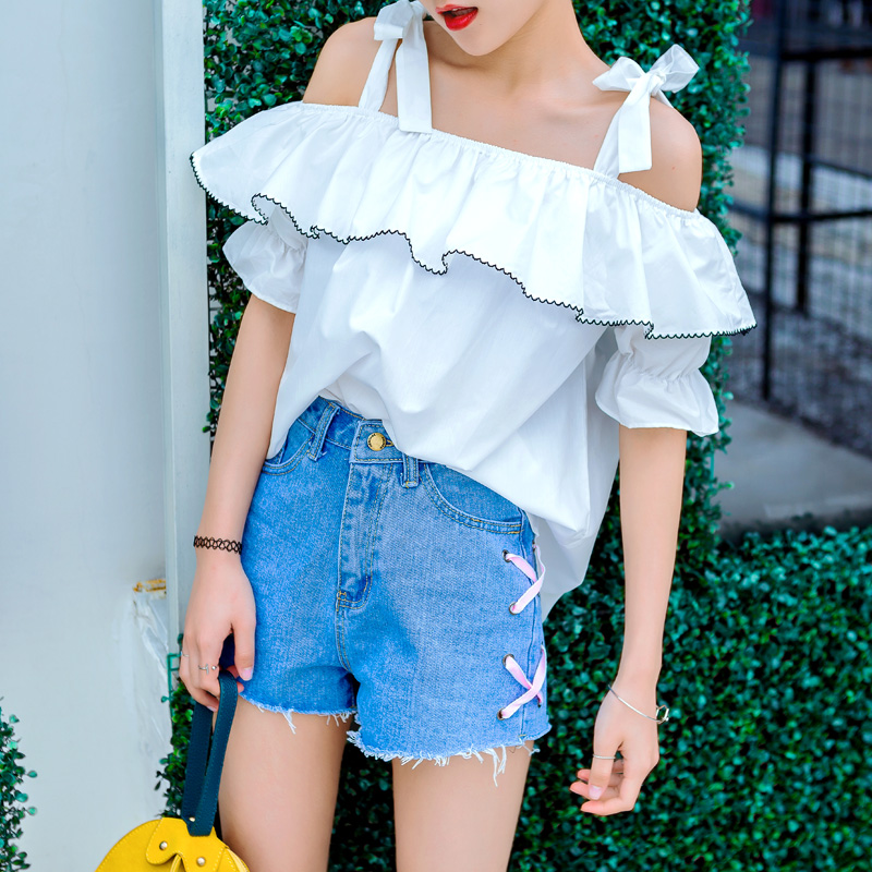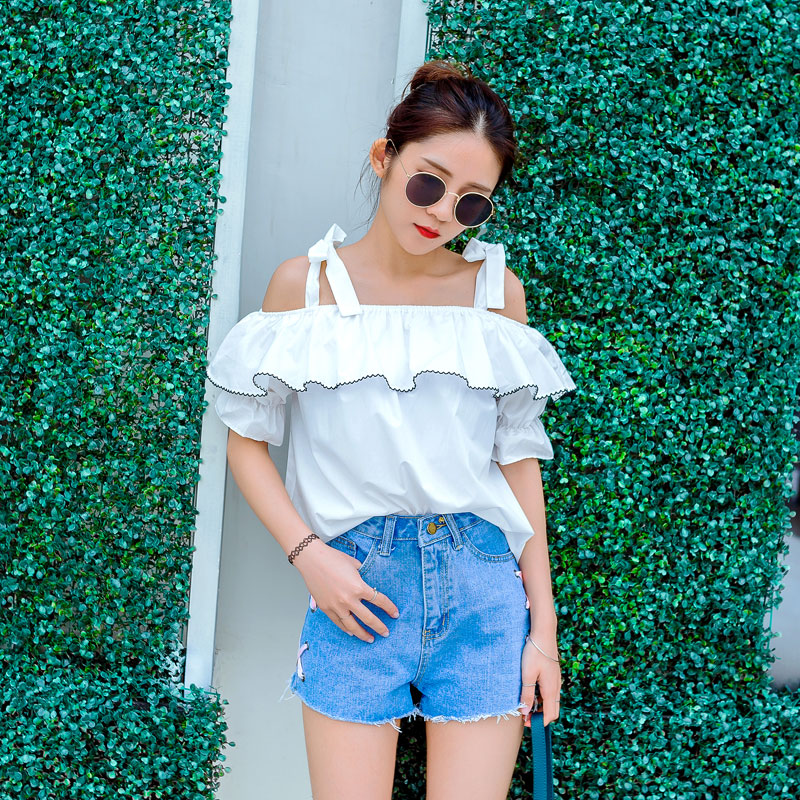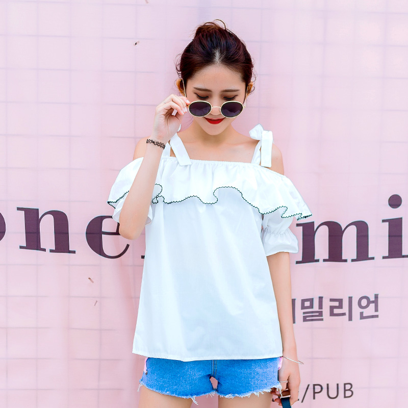 / 夏裝新款女裝韓版露肩吊帶短袖襯衫寬松荷葉邊小清新襯衣上衣
