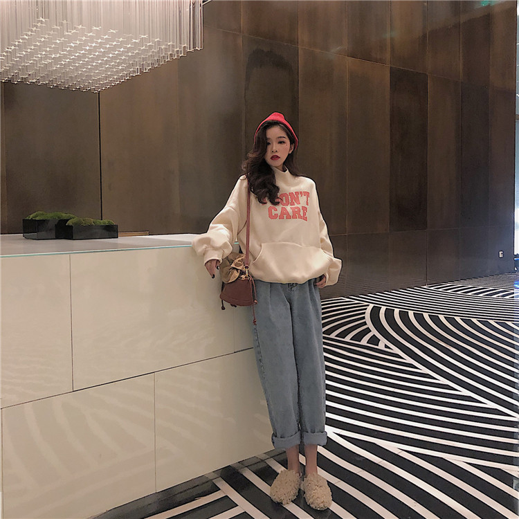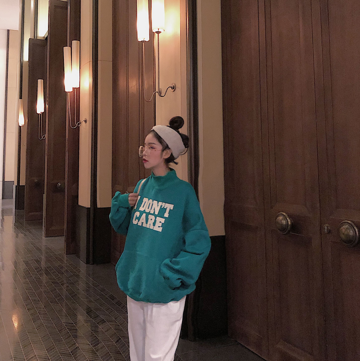 復古港風寬松印花堆堆領內搭字母長袖衛衣女秋冬2018新款打底上衣