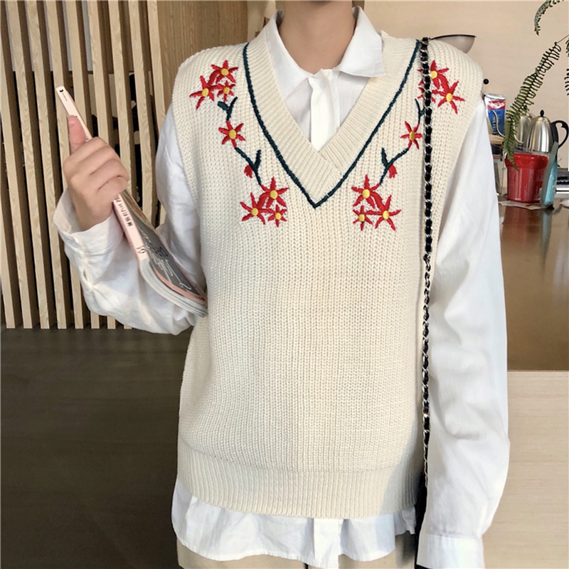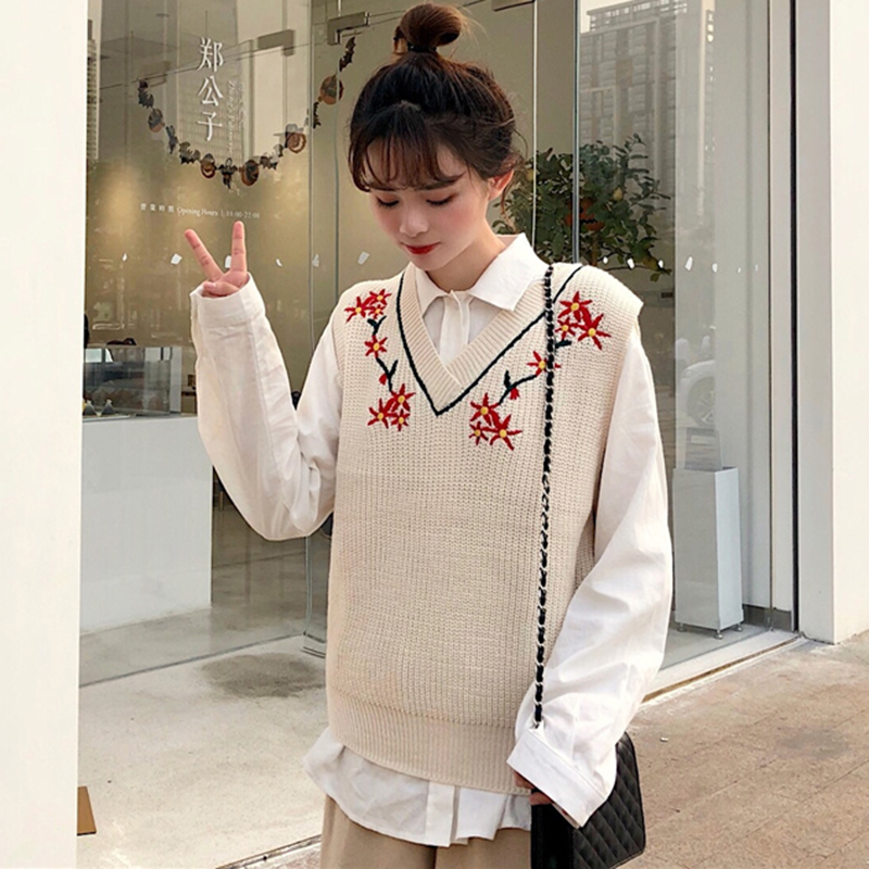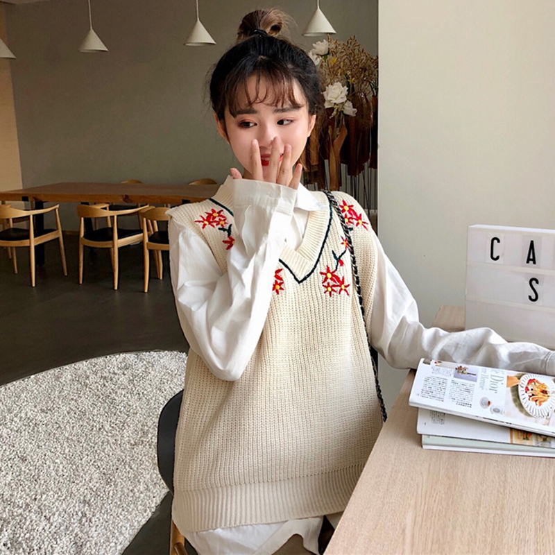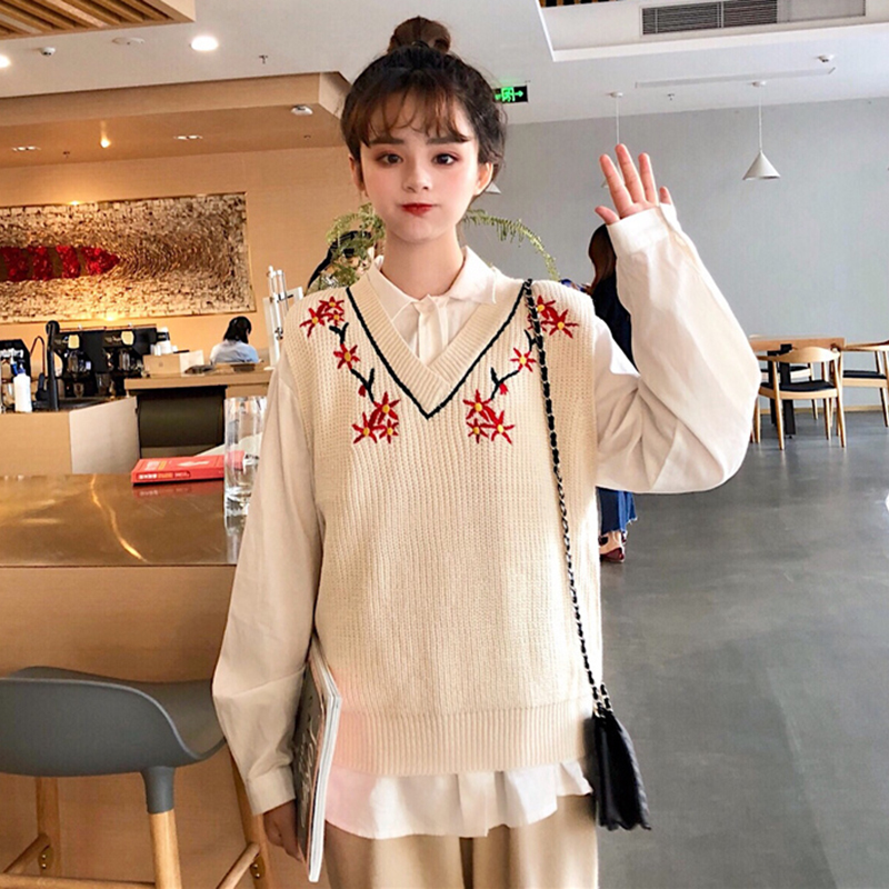 / V領時尚刺繡馬甲毛衣女秋冬裝2018新款修身顯瘦針織背心學生上衣