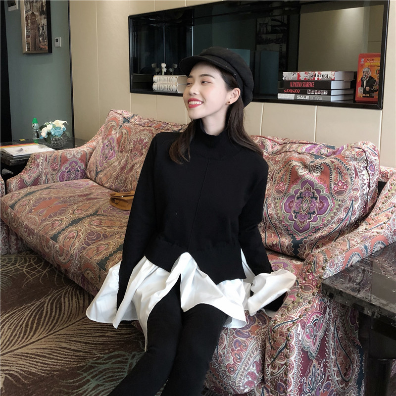 / 秋季新款韓版設計感假兩件拼色半高領不規則喇叭袖襯衫針織衫上衣