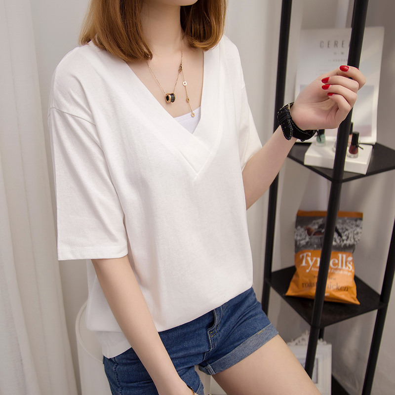 短袖t恤女寬松上衣女夏裝新款女裝白色韓版V領體恤衫打底百搭