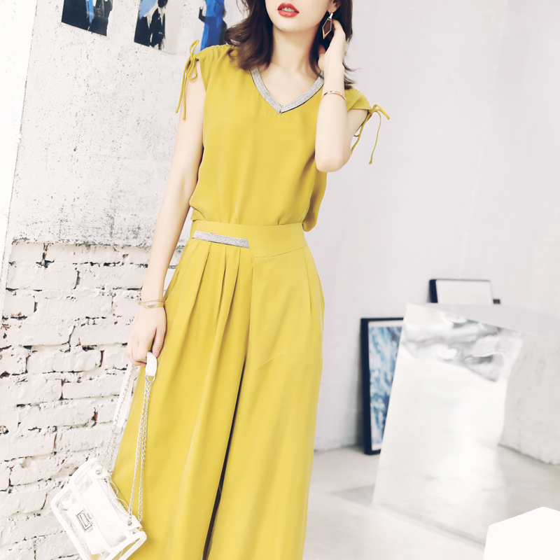 S秀2018夏季新款女裝時尚女神范休閑修身氣質純色闊腿褲套裝潮