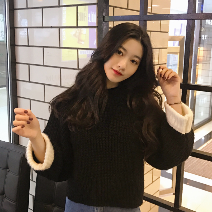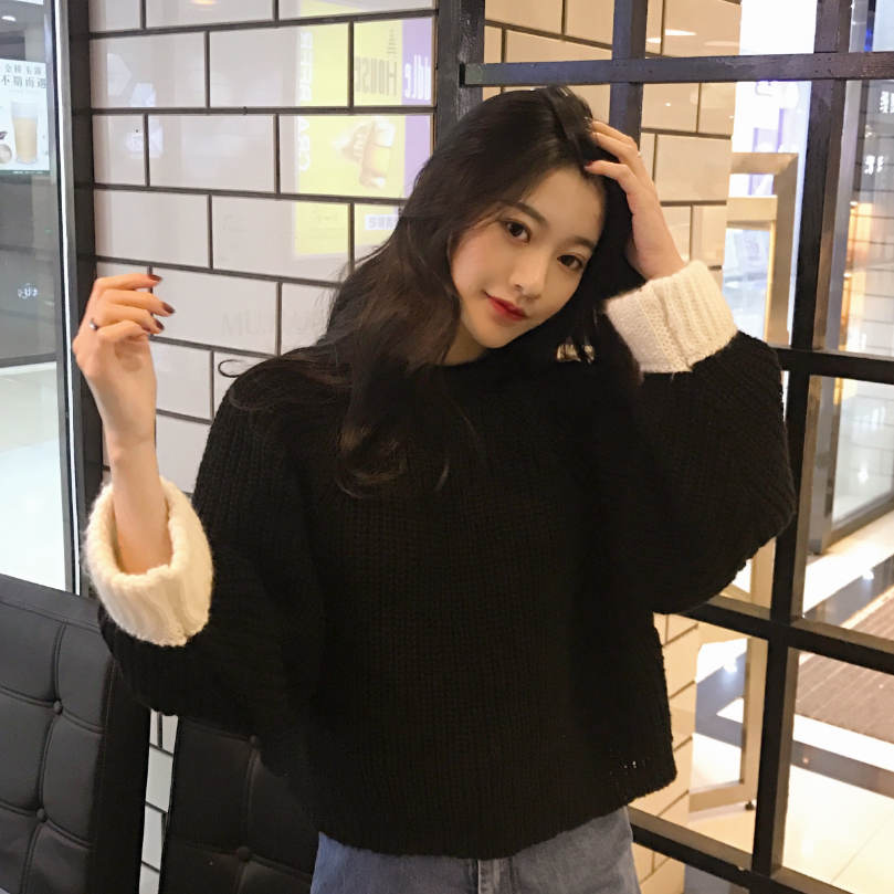 韓版網紅2018新款秋冬寬松慵懶風套頭毛衣女中長款黑白撞色上衣潮