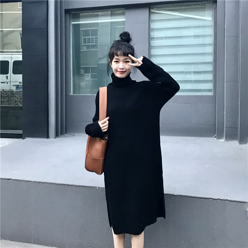 秋冬韓版高領慵懶風中長款寬松打底針織毛衣連衣裙長裙學生裙子女