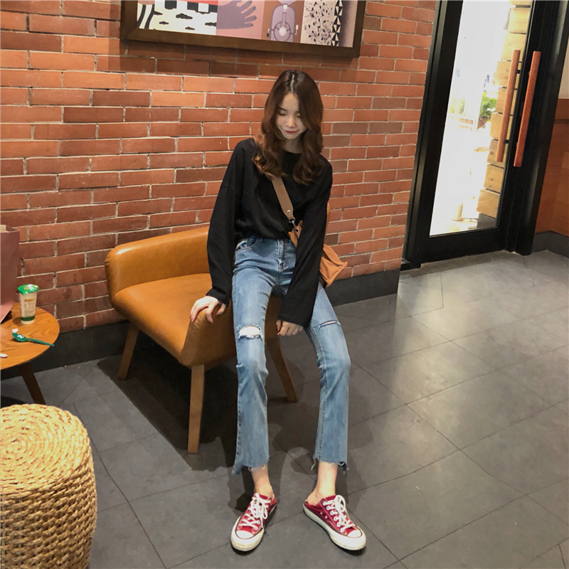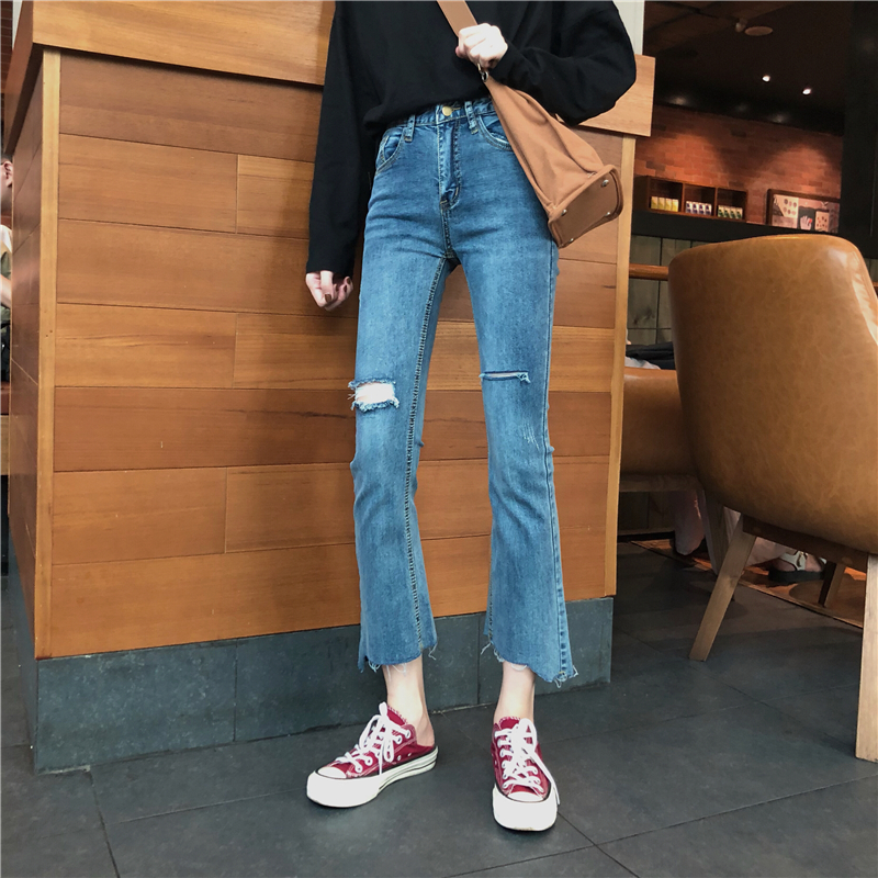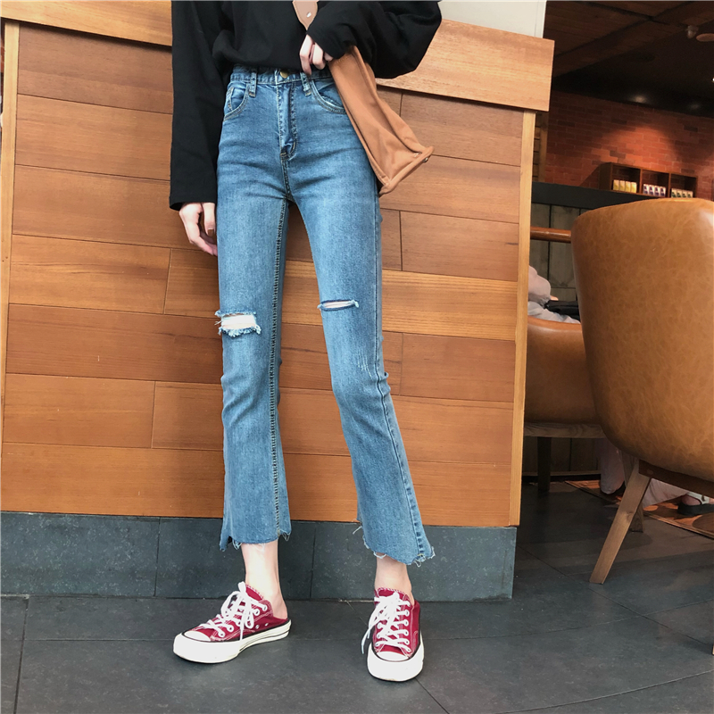褲子女2018新款chic韓國顯瘦不規則撕邊破洞水洗做舊微喇牛仔褲潮