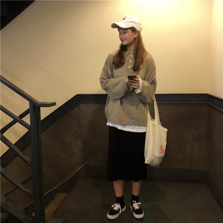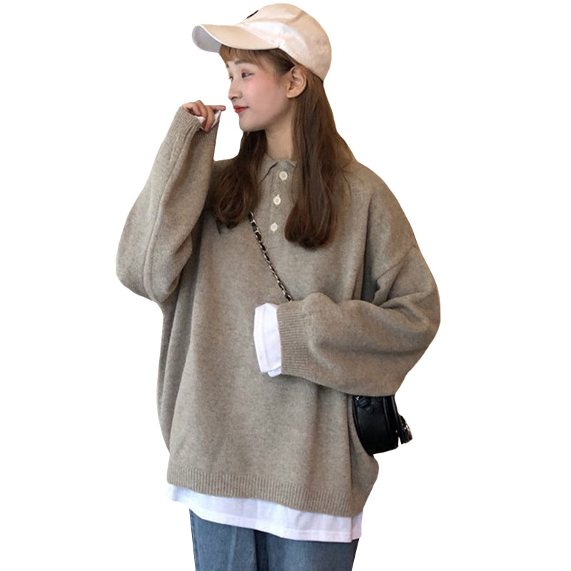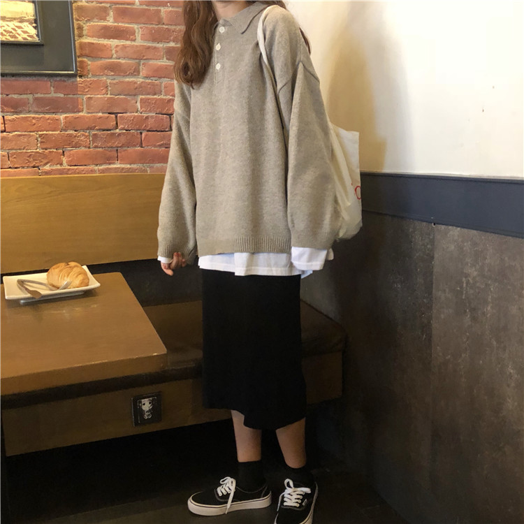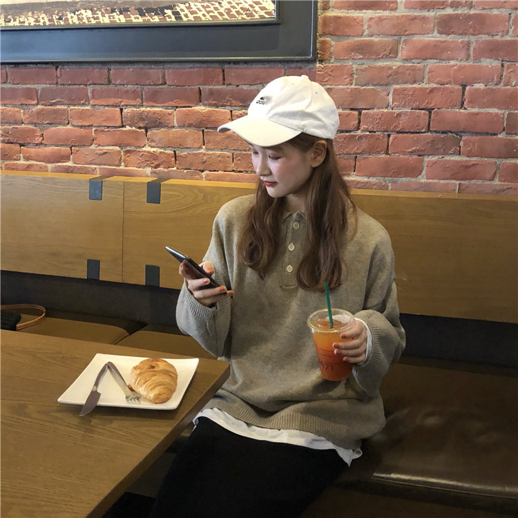 / 秋季韓版BF風寬松小翻領純色慵懶風網紅套頭針織衫毛衣上衣外套女