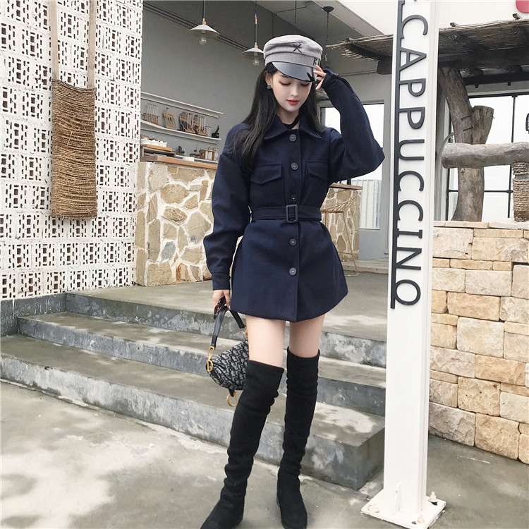 / 復古翻領單排扣綁帶收腰中長款毛呢外套女秋冬2018新款韓版大衣女