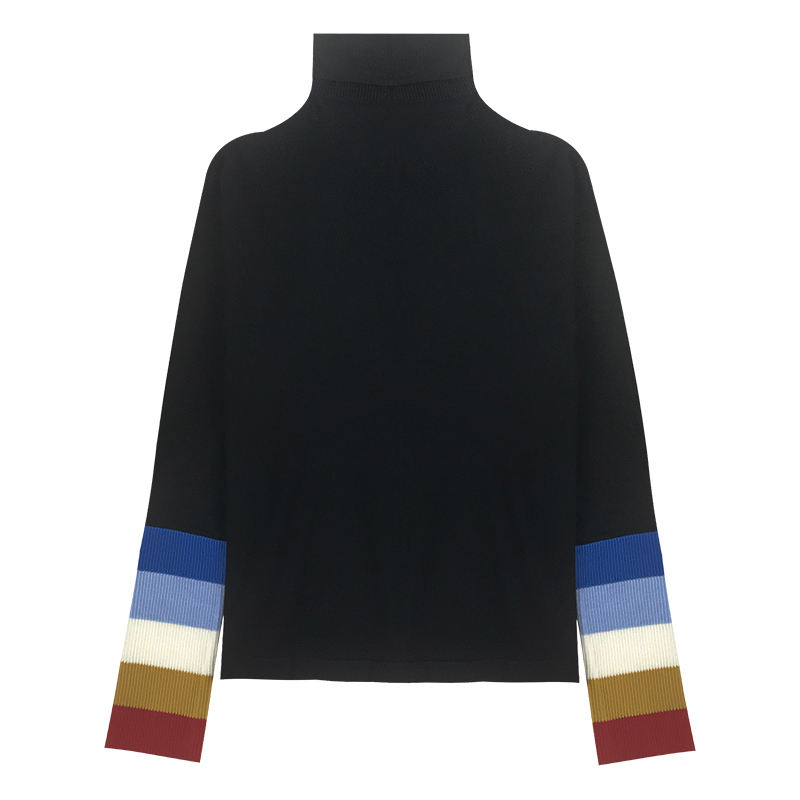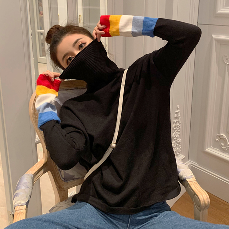 針織外套女秋冬裝2018新款高領打底衫彩虹條紋長袖寬松套頭上衣潮