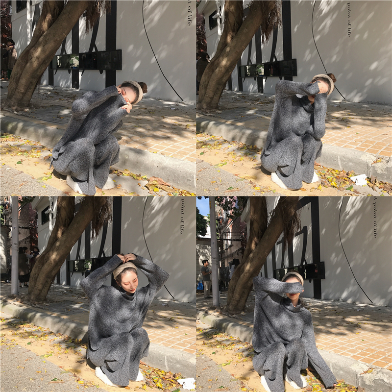 復古慵懶寬松加厚保暖高領毛衣高腰顯瘦針織闊腿褲時尚套裝兩件套