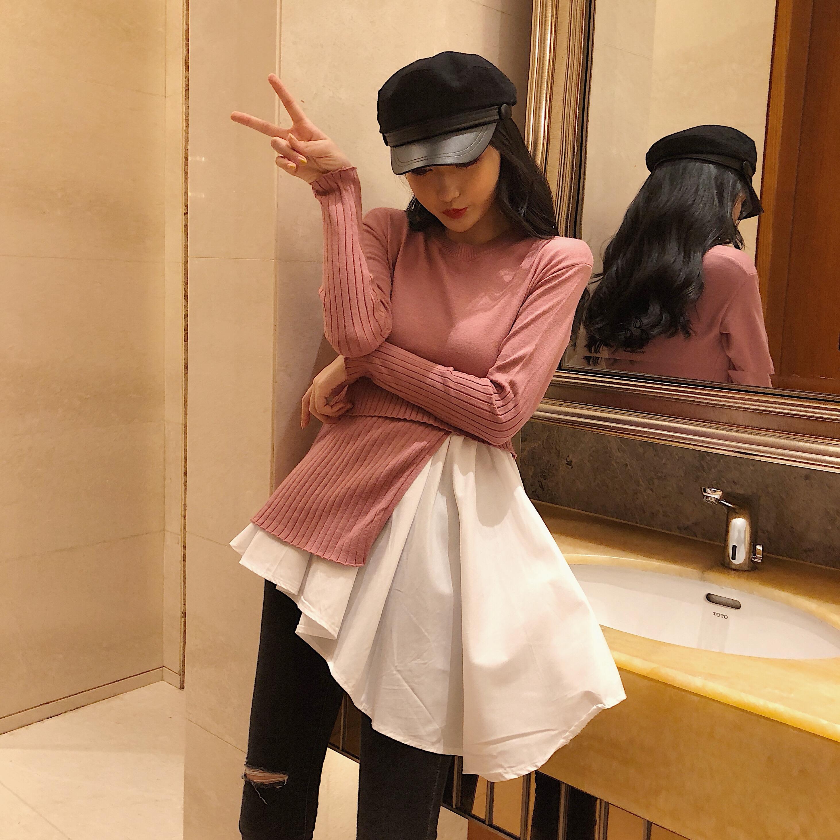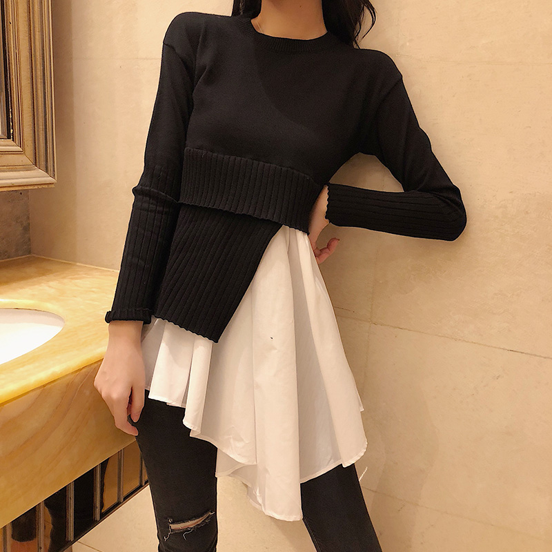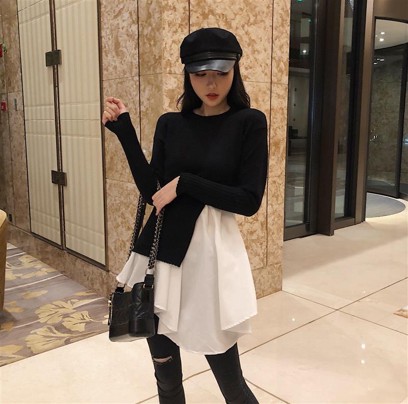 / 2018秋款chic假兩件黑白拼接針織設計感時尚中裙不規則長袖連衣裙
