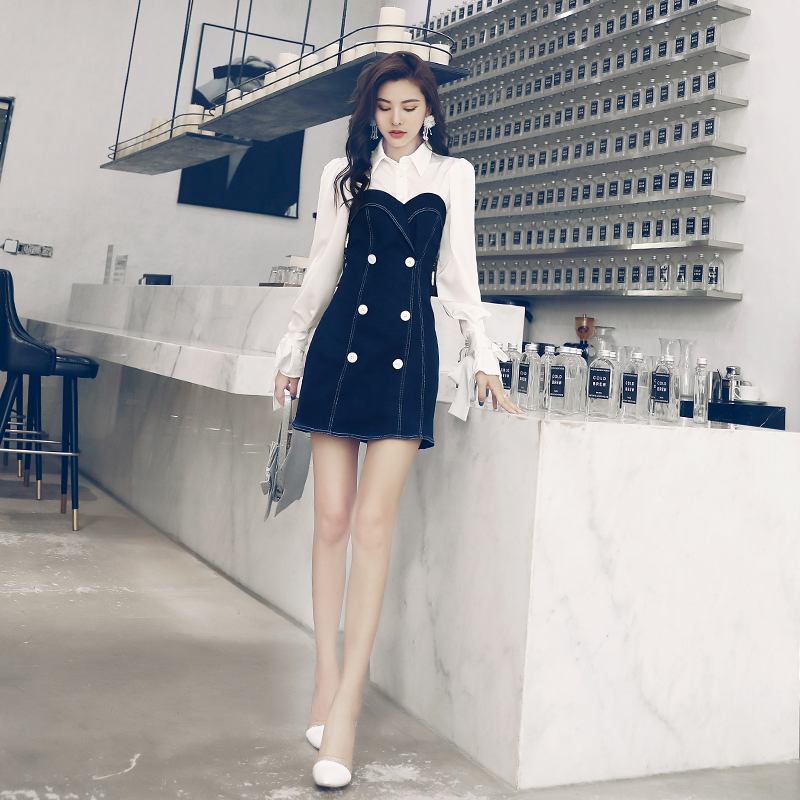 / 兩件套連衣裙女2018秋季新款長袖襯衫牛仔中長款半身裙套裝裙子潮