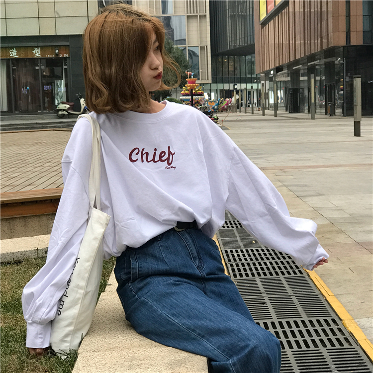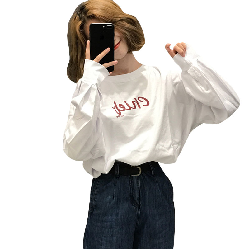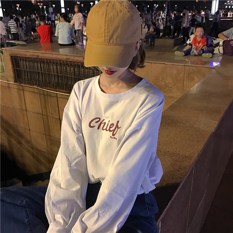 / 秋季女裝韓版寬松百搭顯瘦字母套頭長袖T恤中長款休閑體恤上衣潮