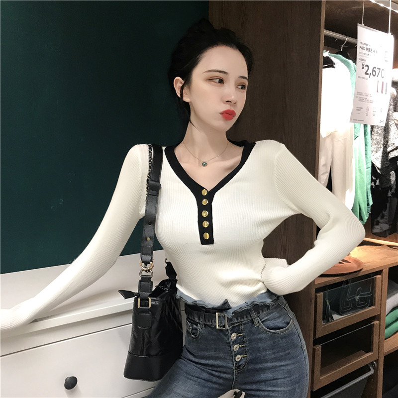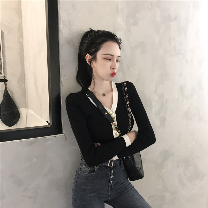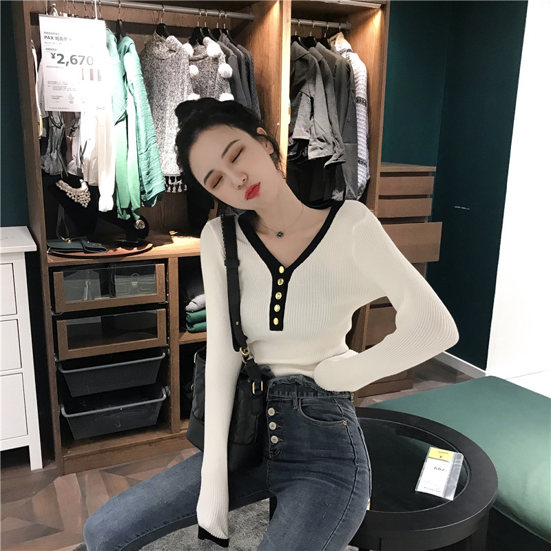 / 2018秋裝新款chic上衣女顯瘦百搭打底衫時尚復古V領套頭針織衫潮