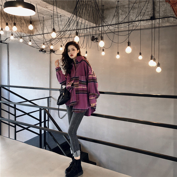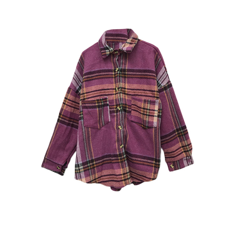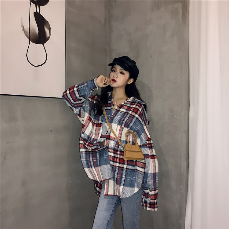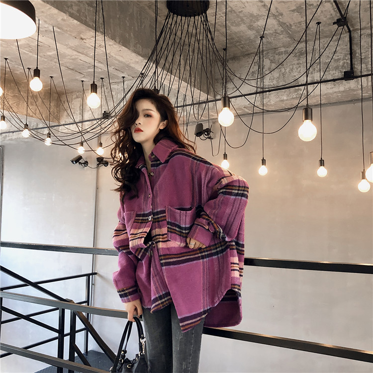 襯衣女2018新款港風顯瘦oversize慵懶寬松格子泡泡袖毛呢襯衫外套