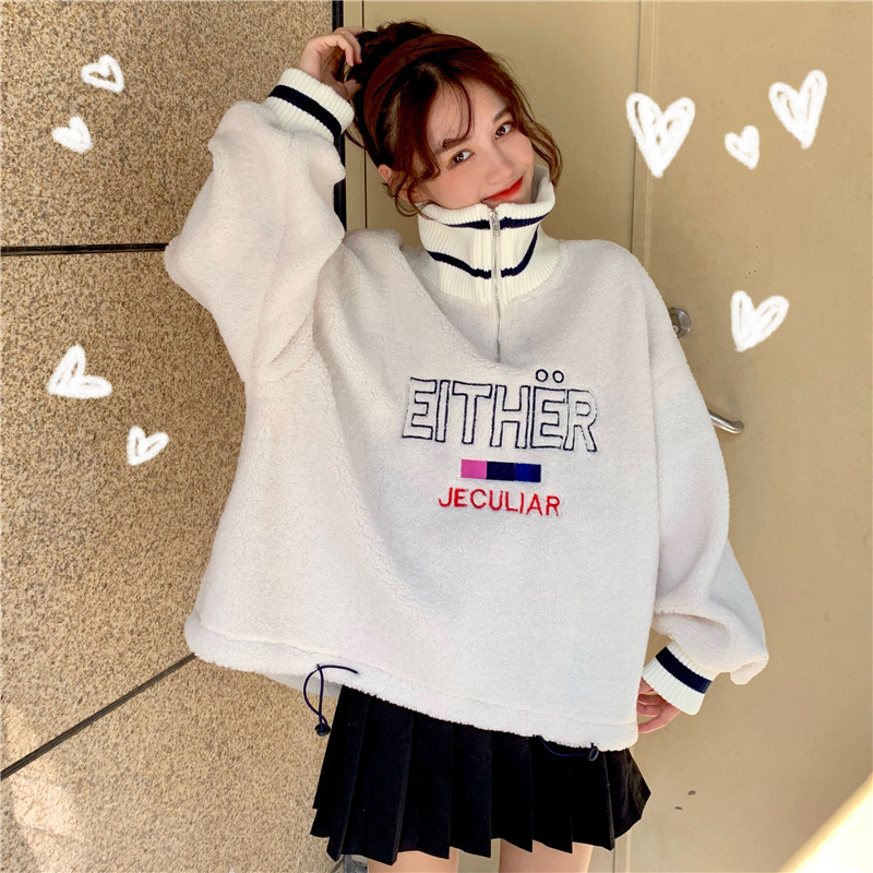 / 寬松顯瘦羊羔毛加厚保暖套頭衛衣女2018新款復古韓版高領字母絨衫