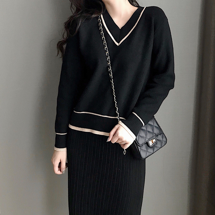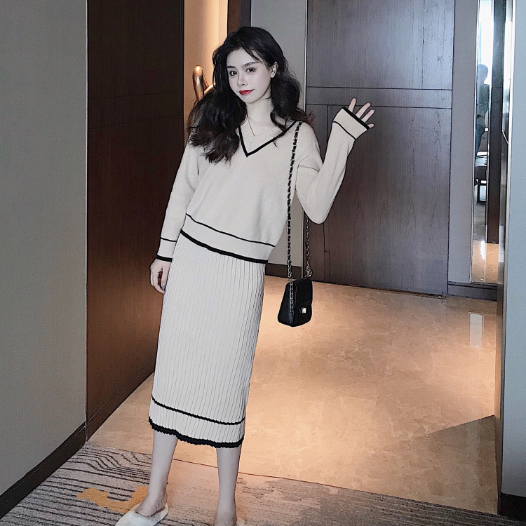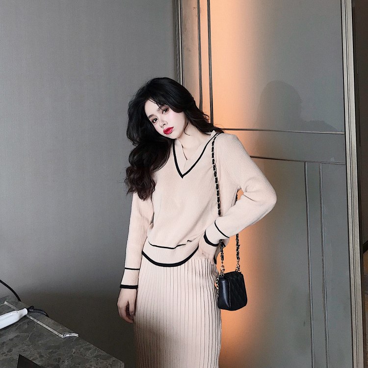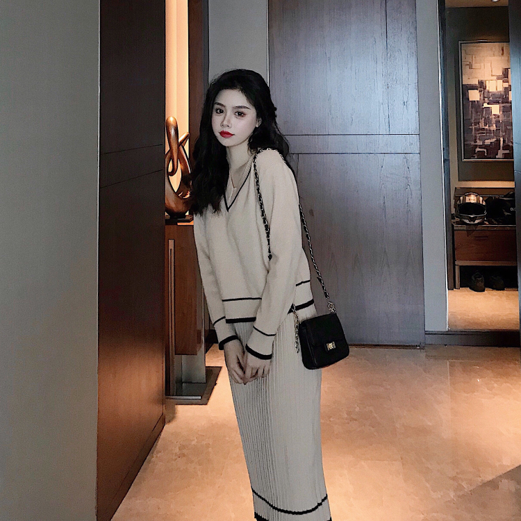 / 小香風2018秋冬寬松百褶針織半身裙長袖v領上衣套裝時尚兩件套女