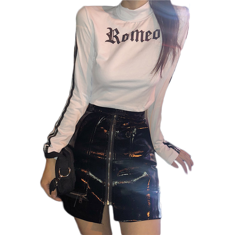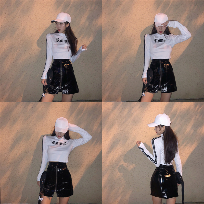 / 秋2018新款印花字母半高領長袖T恤+百搭a字高腰包臀半身裙分開拍