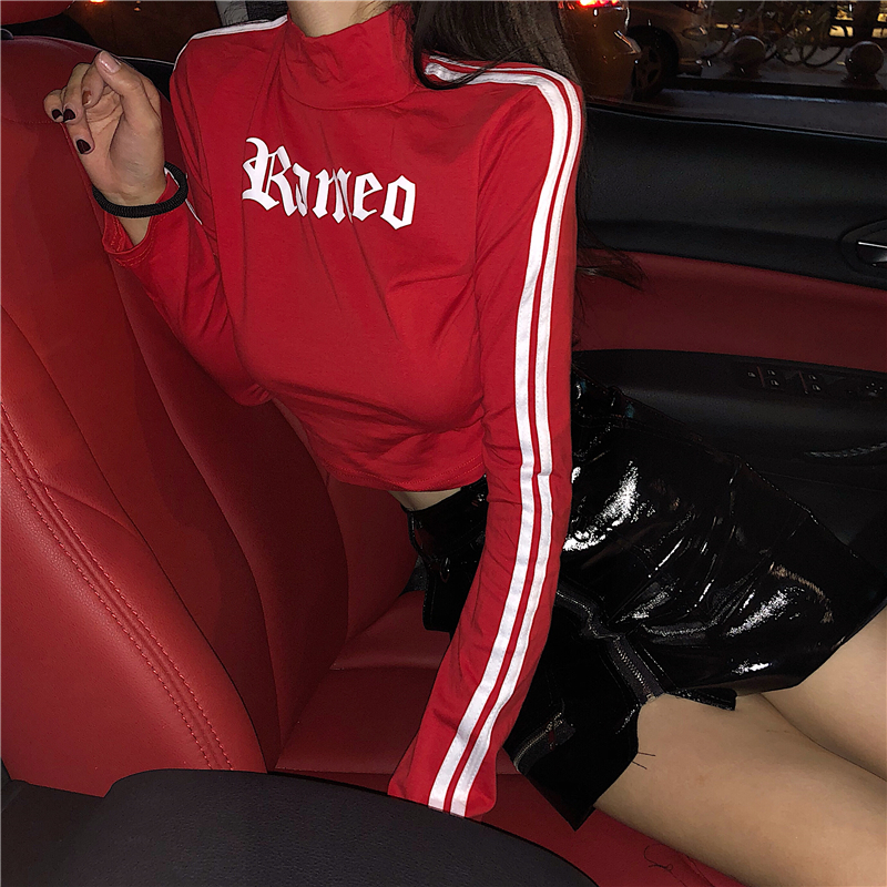 秋2018新款印花字母半高領長袖T恤+百搭a字高腰包臀半身裙分開拍