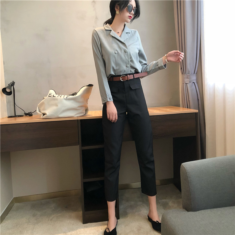 2018新款韓版時尚套裝chic復古翻領格子小西裝外套休閑褲配皮帶潮