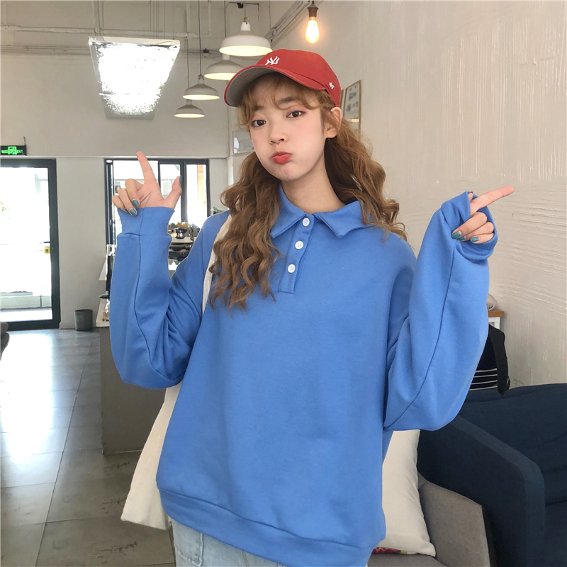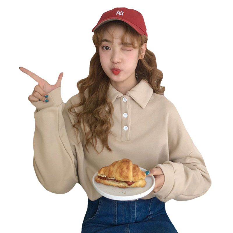 2018新款秋冬女裝韓版學院風寬松純色Polo領套頭加厚衛衣上衣外套
