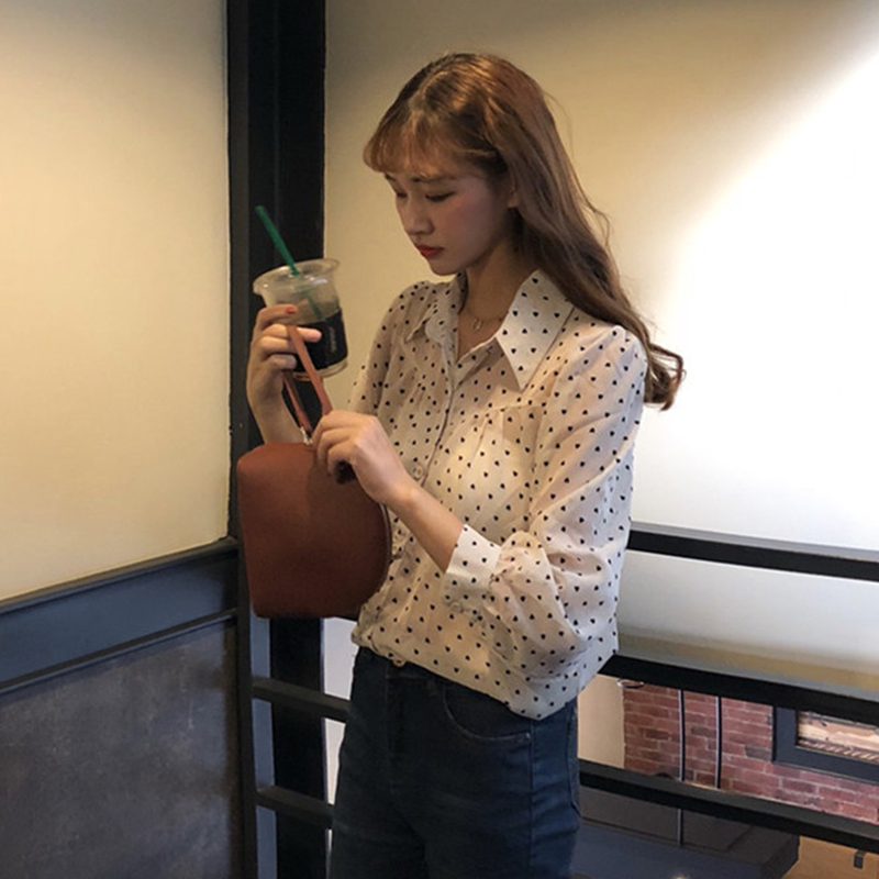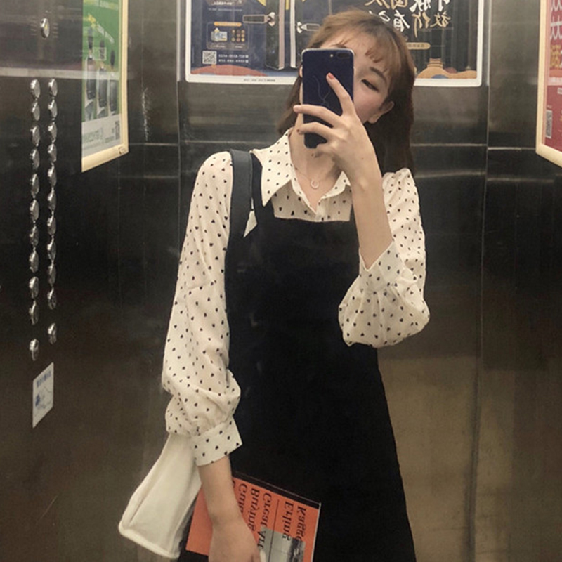 / 早秋兩件套裝女2018新款寬松長袖愛心雪紡襯衫氣質休閑黑色背帶裙
